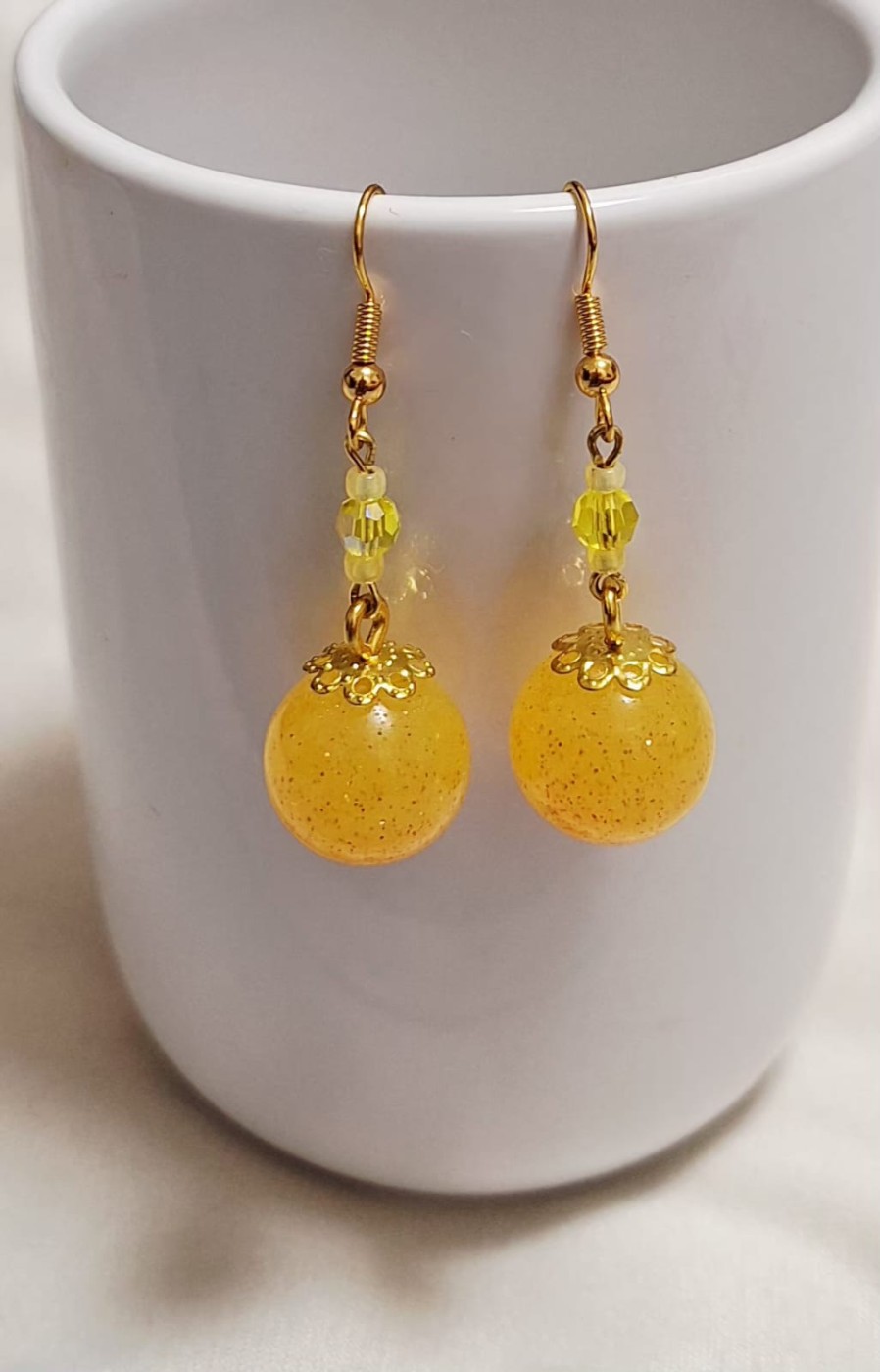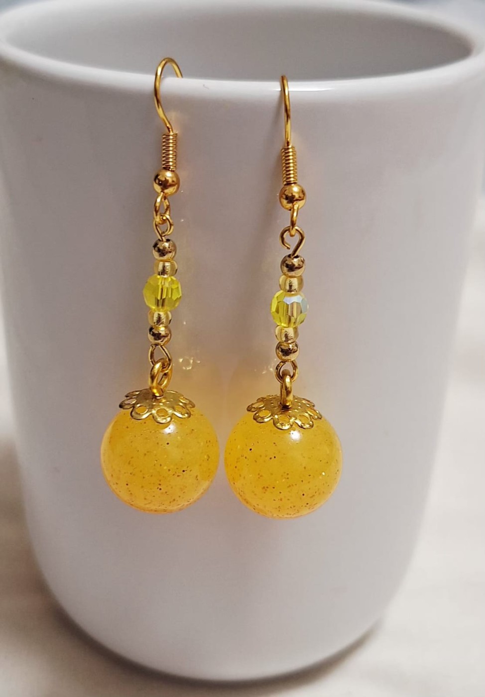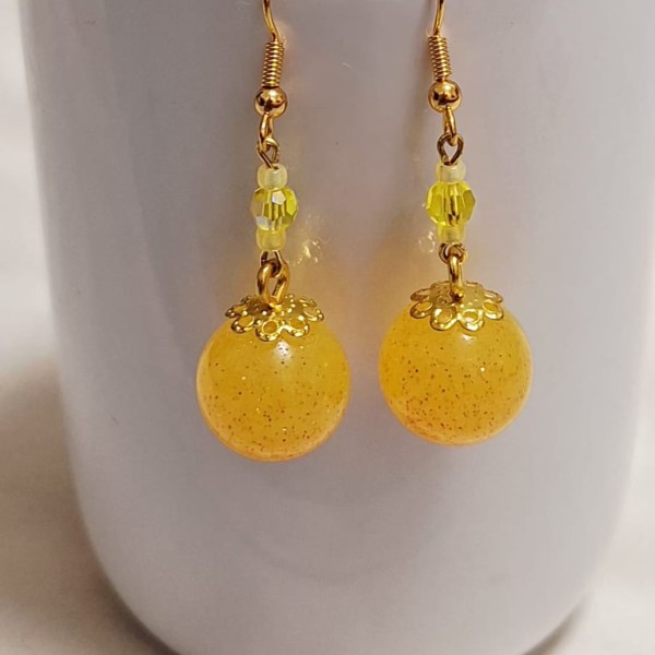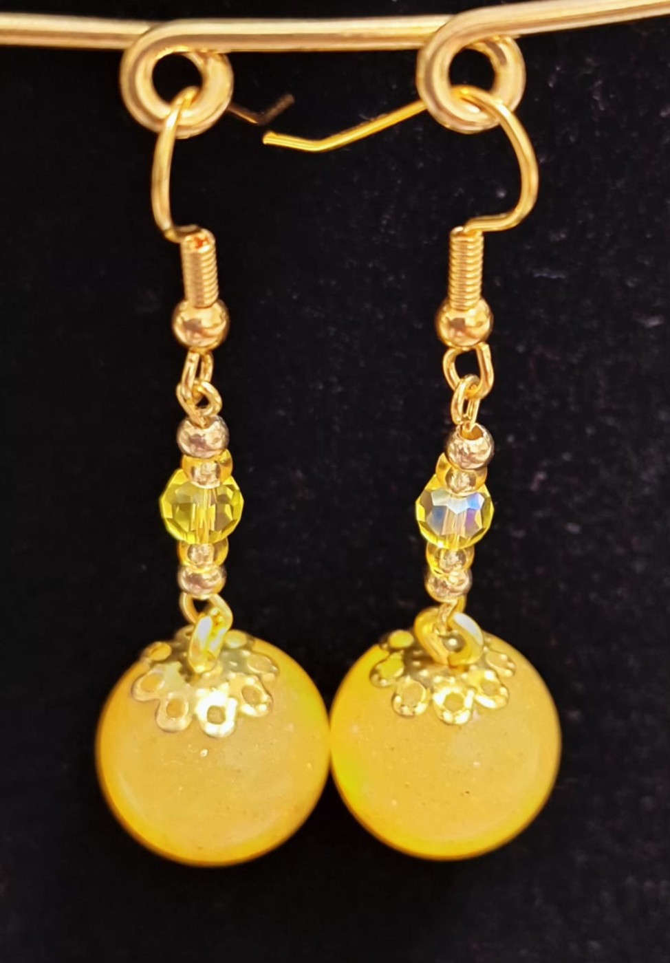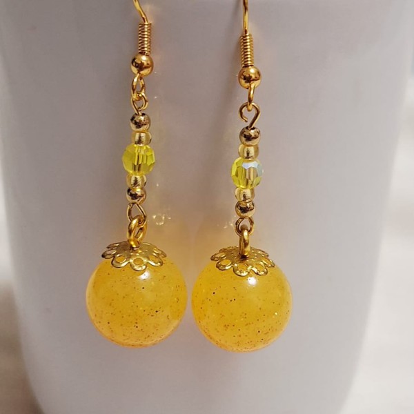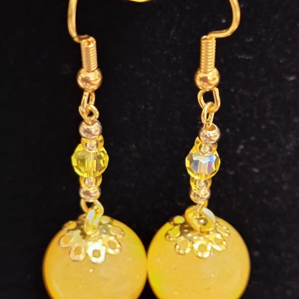 Auskaru lielā pērles izgatavotas no epoksīda sveķiem (roku darbs), pārējās sastāvdaļas: a) pirmais pāris: Primero kristāli (Austrija), Japāņu pērlītes, apzeltīta metāla furnitūra;