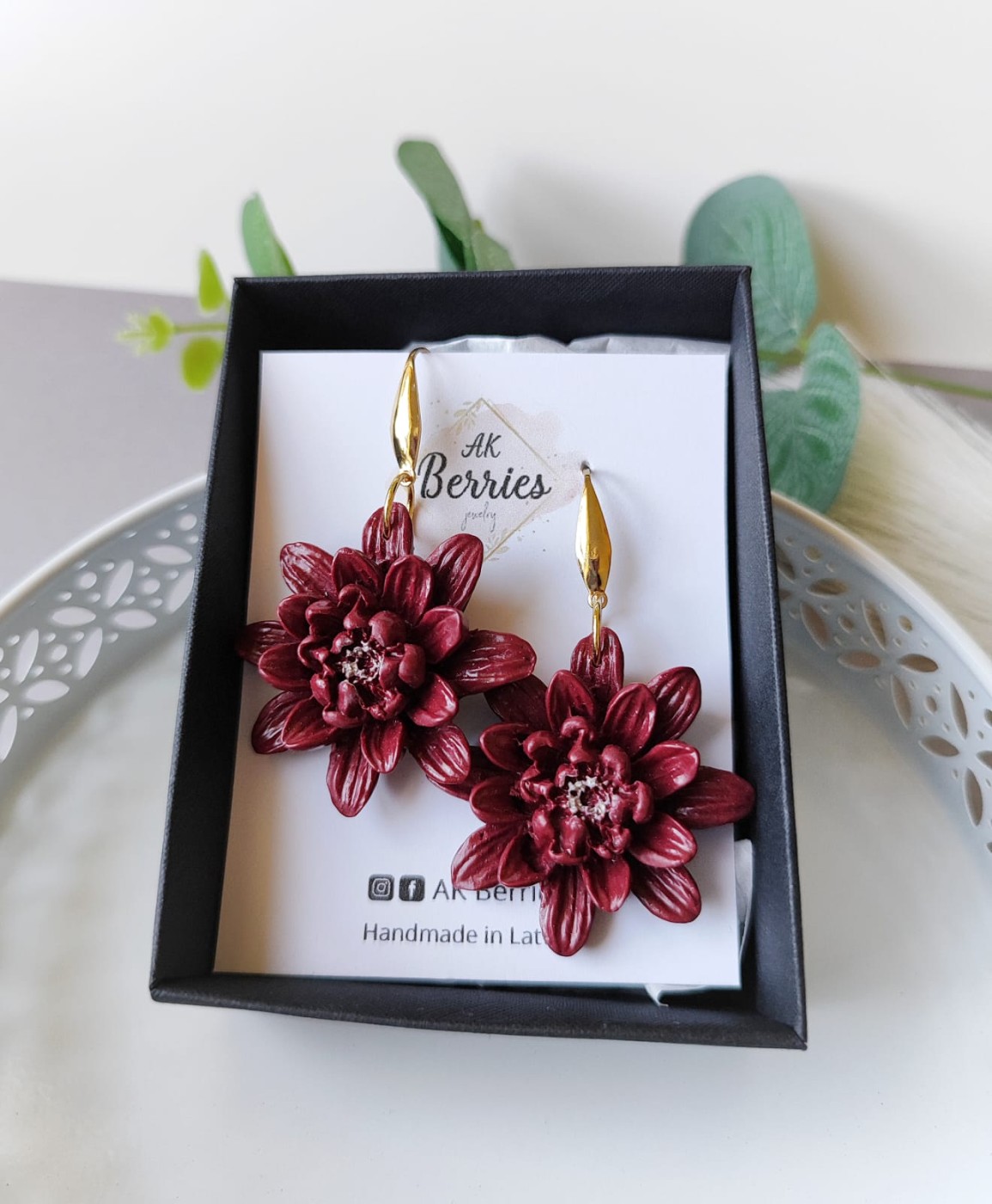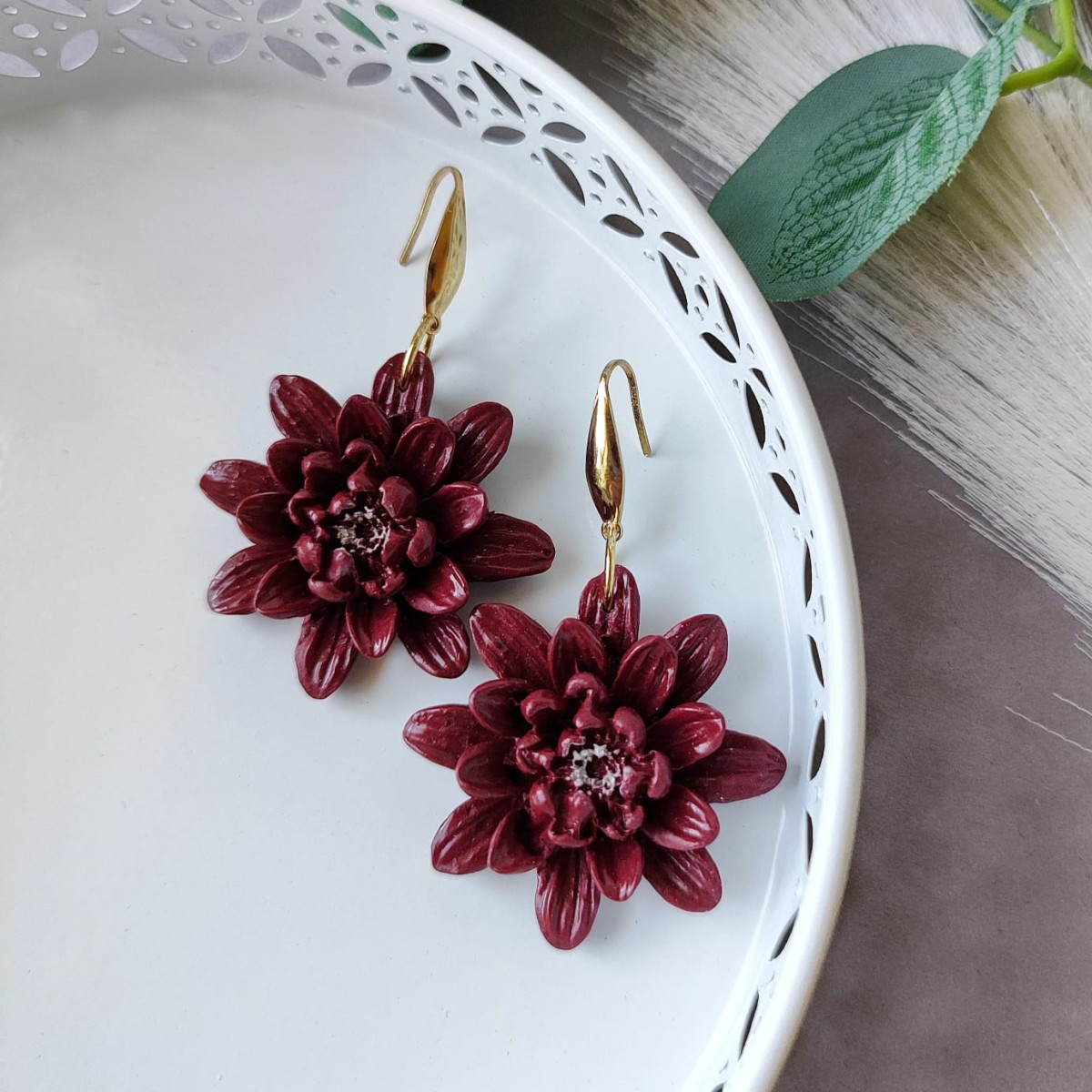 Bordo ziedu auskari no polimērmāla - elegants un izteiksmīgs aksesuārs.