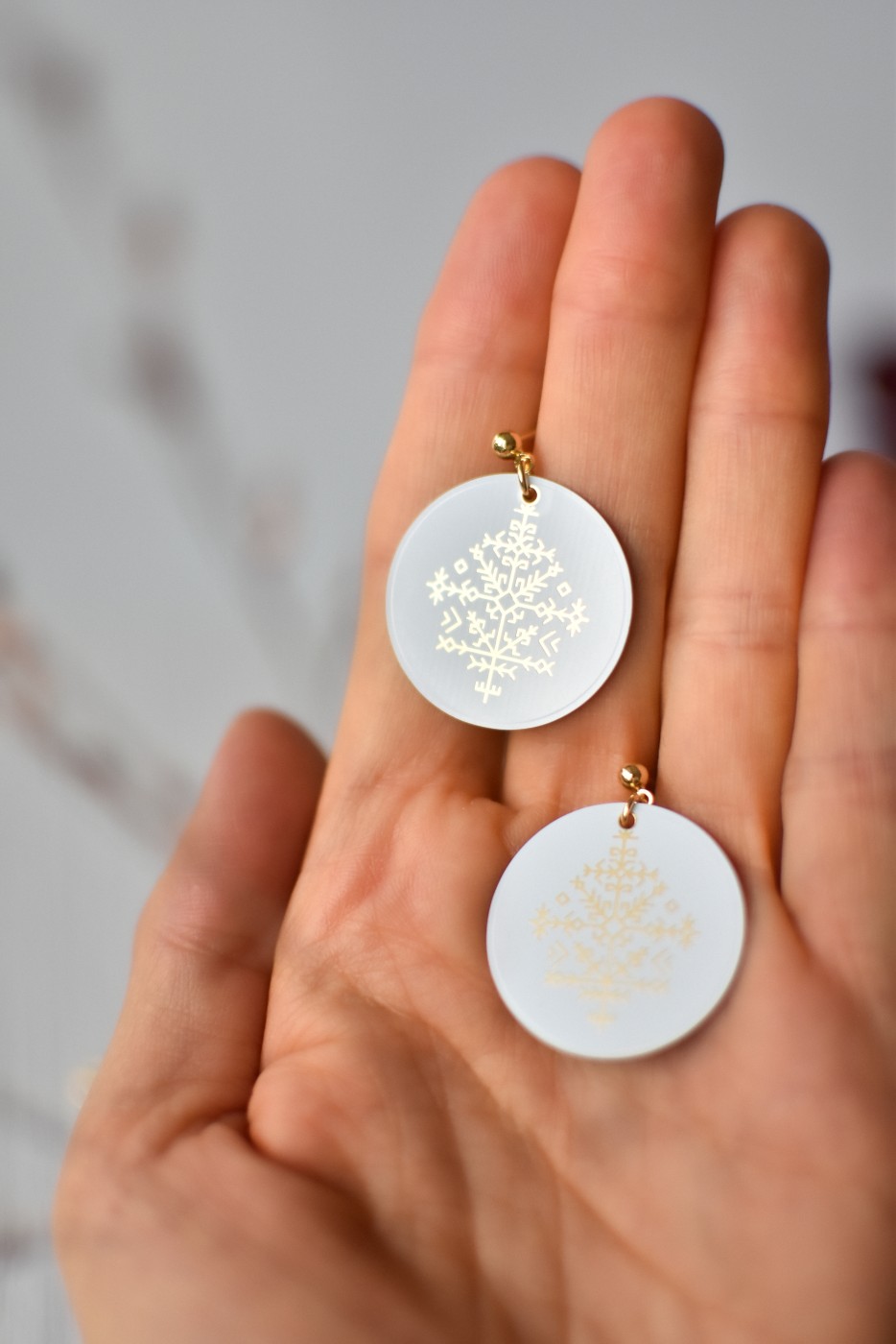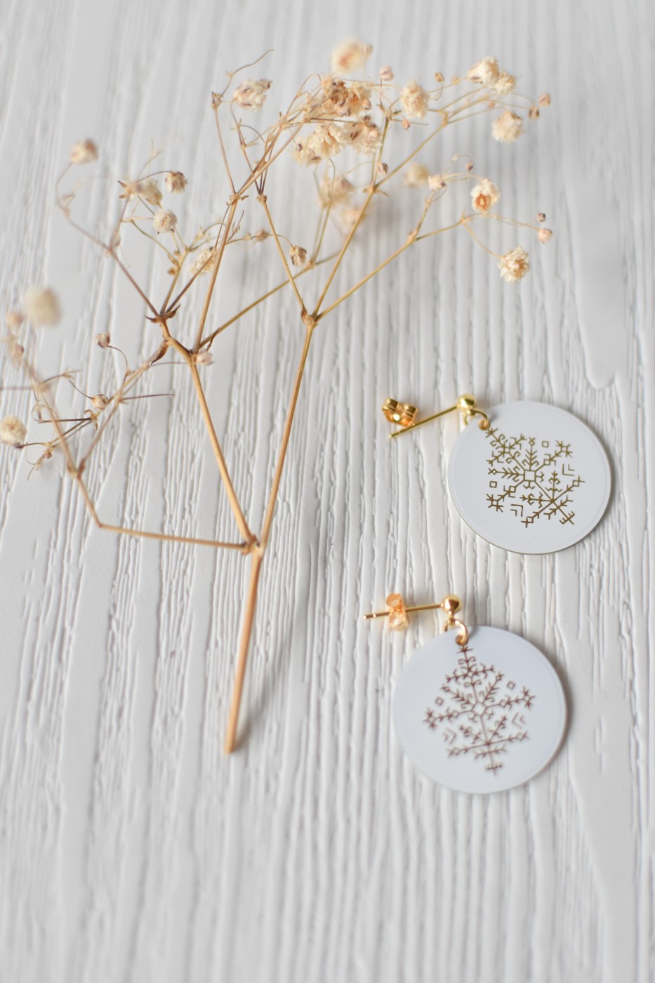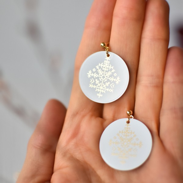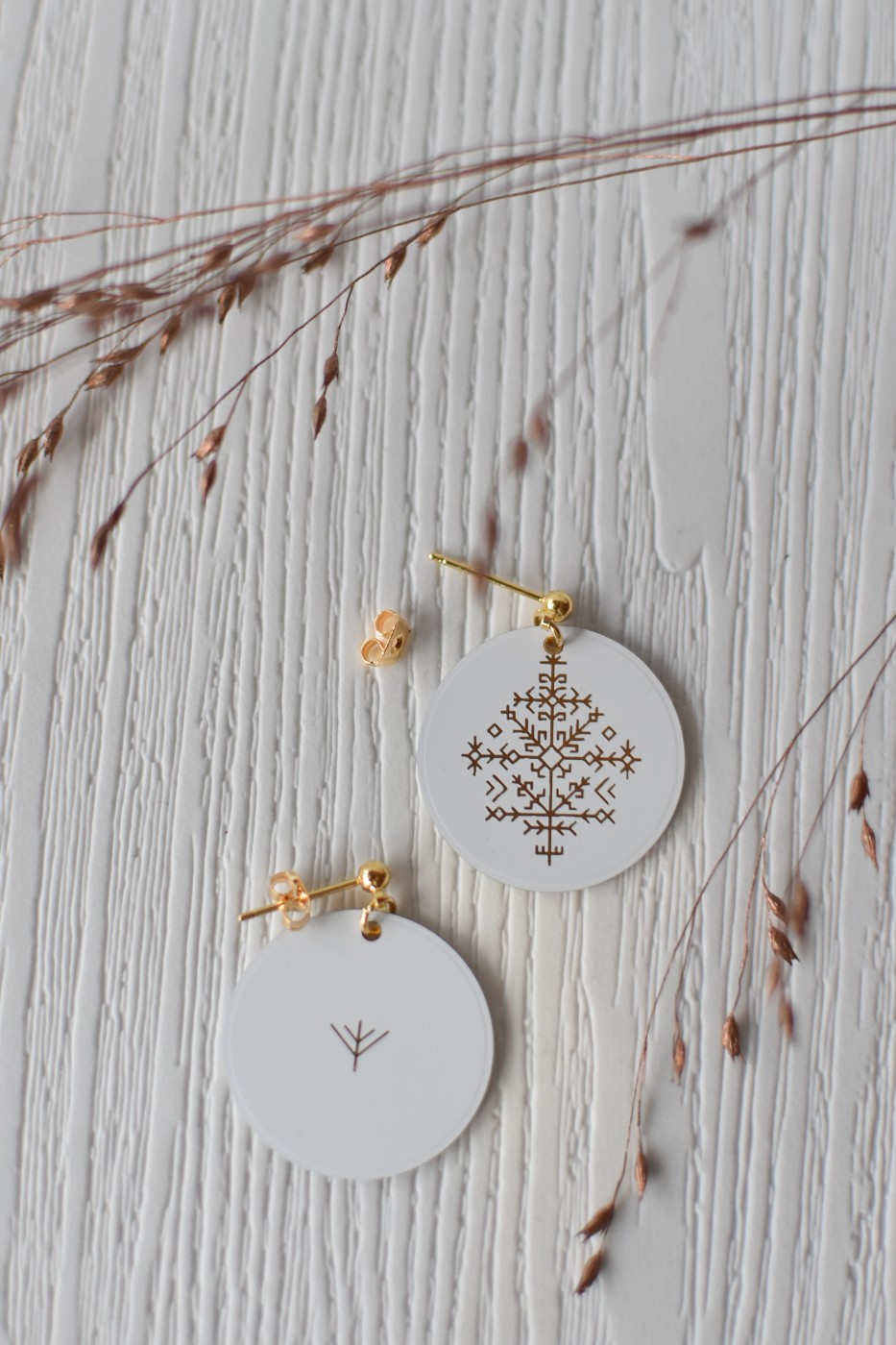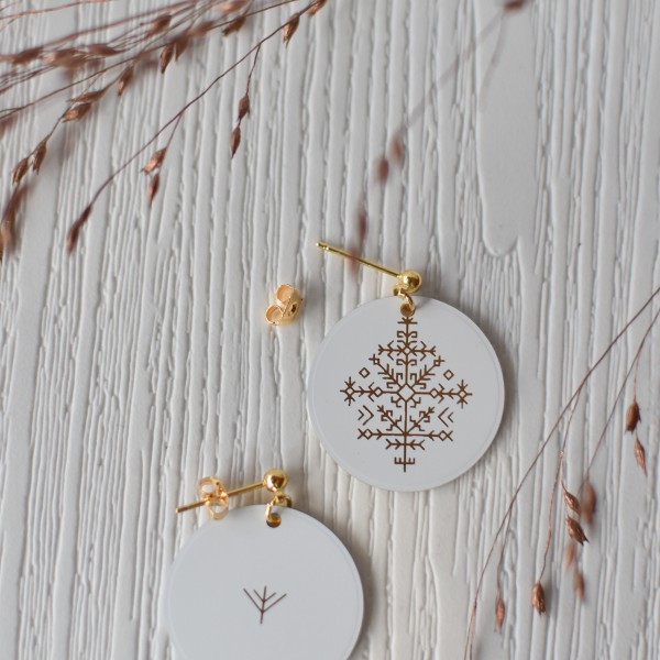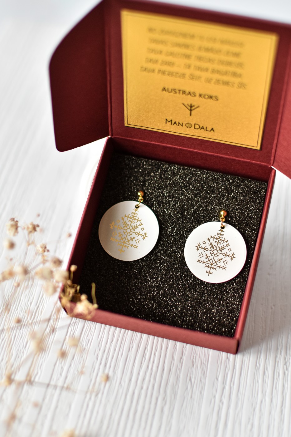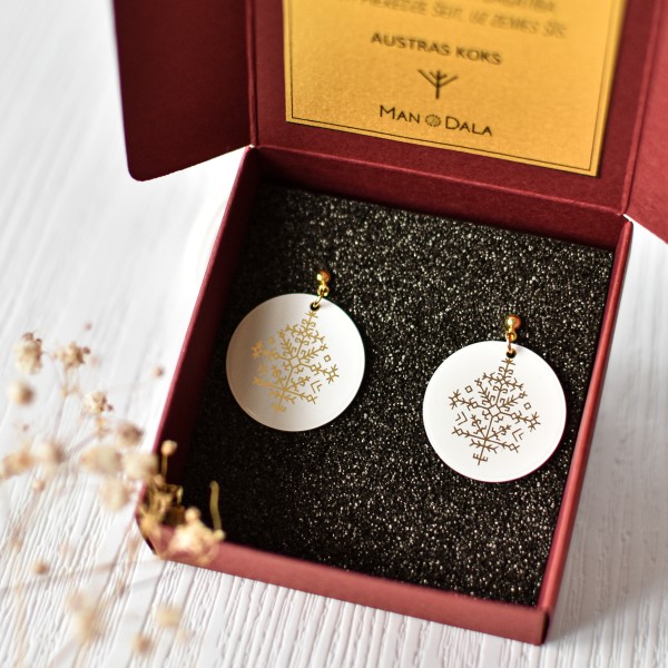 Auskari ir veidoti no vairāku materiālu salikuma (pamatne no vara un epoksīda, raksts ar zelta pārklājumu. Nagliņaizdarēm ir zelta pārklājums). Kā pārsteigums auskaru aizmuguri rotā mazais Austras koka simboliņš.
