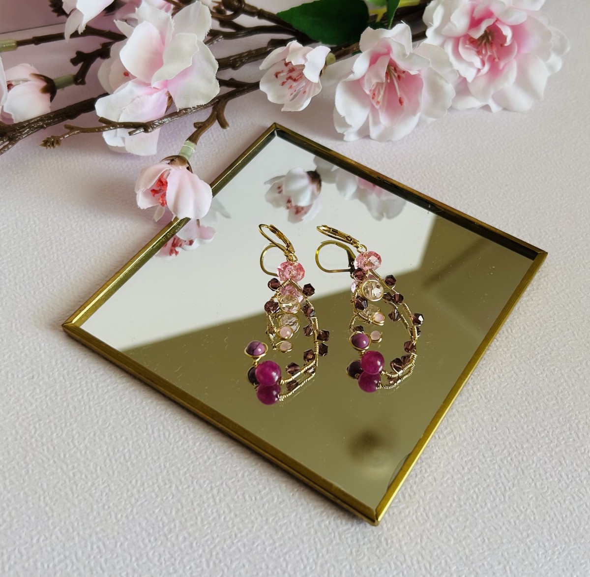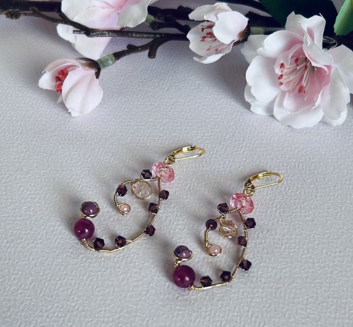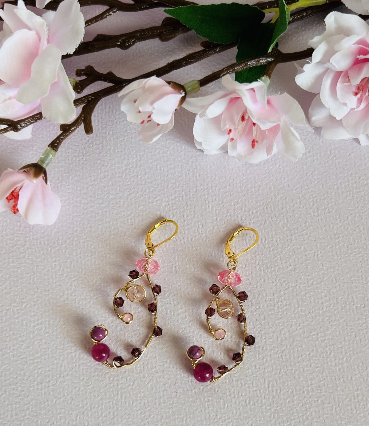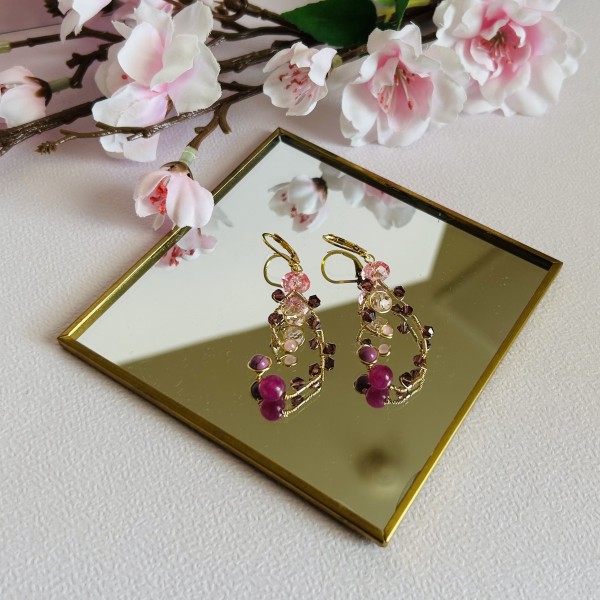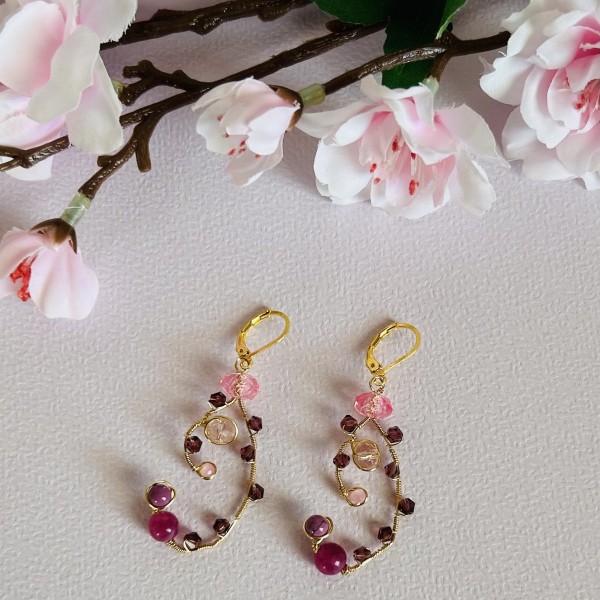 Smalki, rokām darināti auskari romantiskos rozā un ogu toņos. Zelta pārklājuma stieplē veidots viegls, pusloka formas vijums, kurā iepītas dažādu formu stikla un kristāla pērlītes. Kompozīciju papildina maigas rozā un dziļākas violeti sārtas pērlītes, kas kopā rada rotaļīgu, viegli kustīgu rotas rakstu.