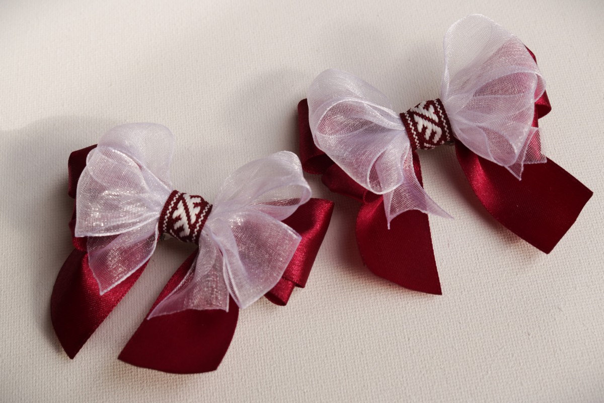 Latviskas matu rotas. Viedotas kā bante, ar latviska raksta (1.att. "ūsiņš" vai 2.att. "zalktis") prievīti vidū, aizmugurē spraude/knaģis. Platumā ap 7 cm.