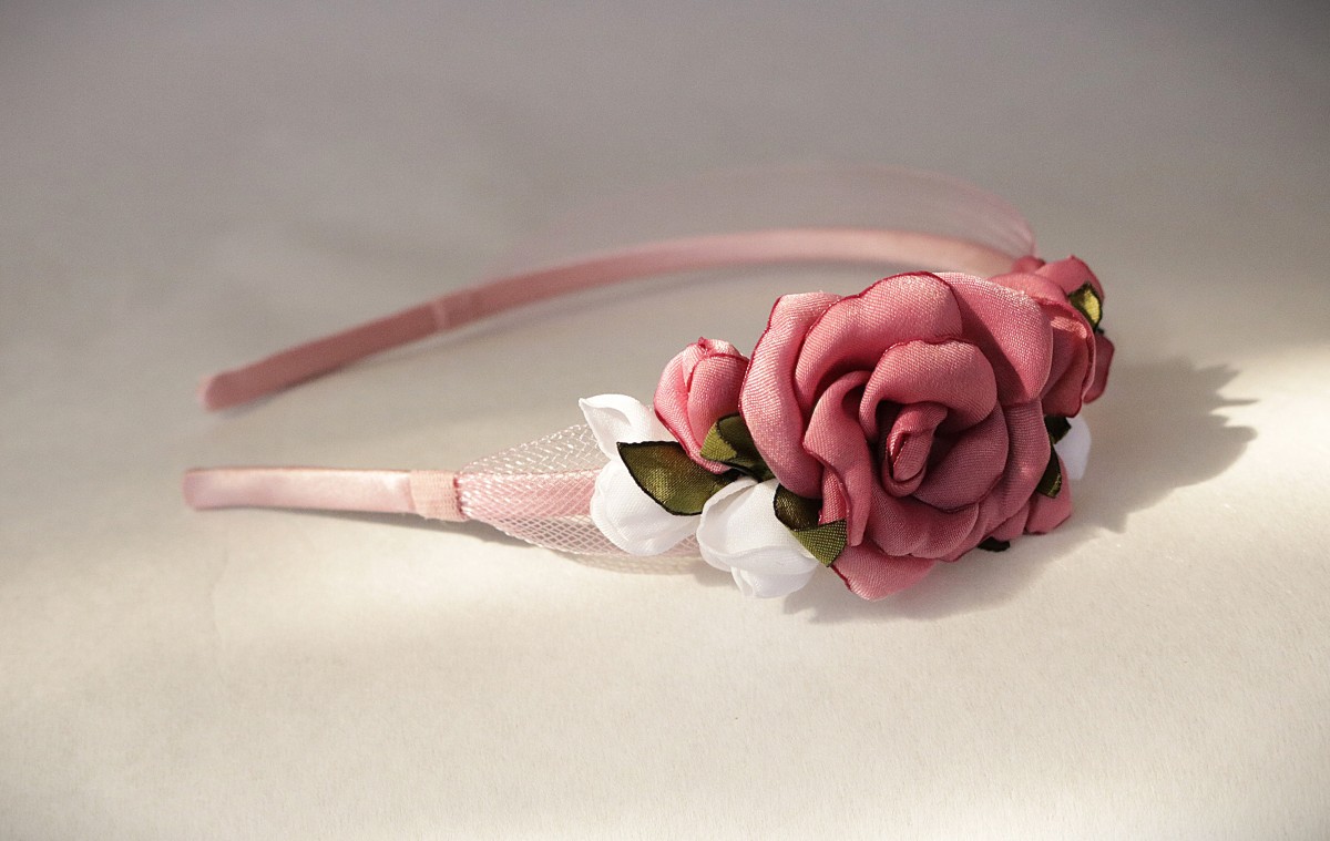 Auduma ziedi, piešūti pie matu stīpas un krinolīna lentes.