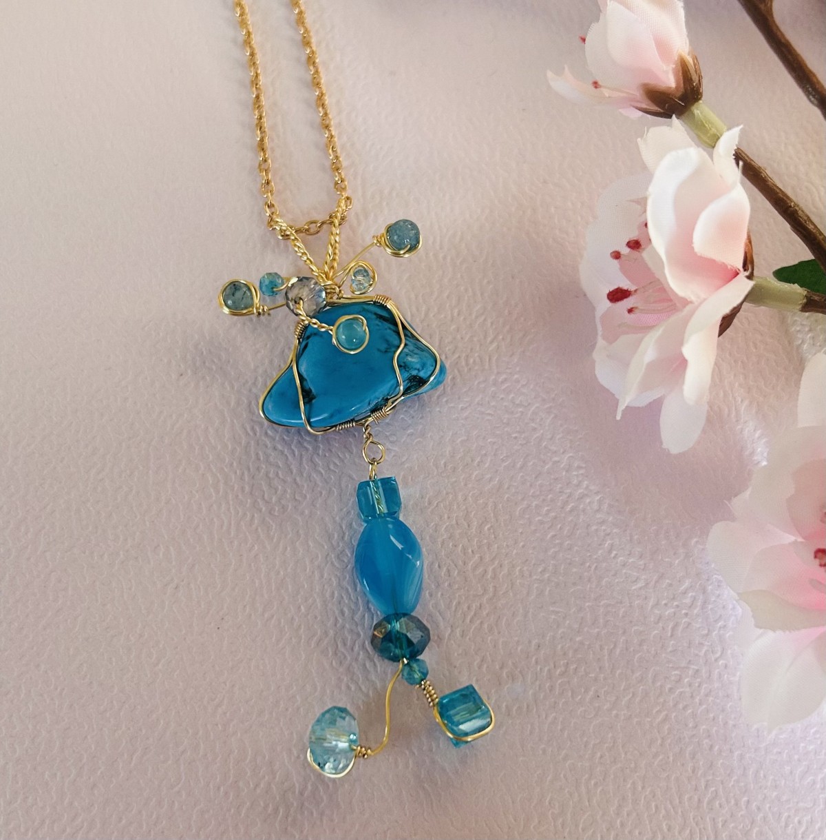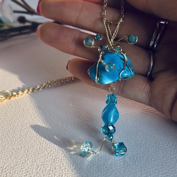 Divdaļīga, rokām darināta rotaslieta ar izteiksmīgu tirkīza akmeni un zilganām pērlītēm. Rotas centrā ievietots dabīga izskata Turquoise akmens, kas ar 0,5 mm un 0,3 mm zelta pārklājuma stiepli veidots dekoratīvā, plūstošā stiepļu ietvarā. Smalkie stieples vijumi papildināti ar nelielām zilām pērlītēm, kas piešķir rotai gaisīgumu un rotaļīgu kustību.