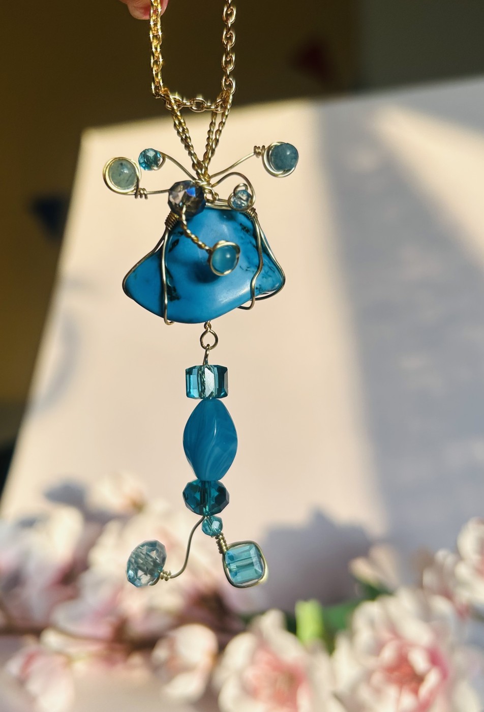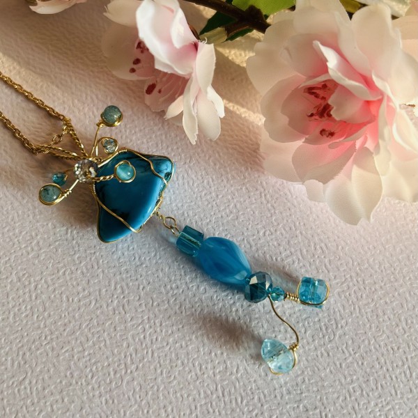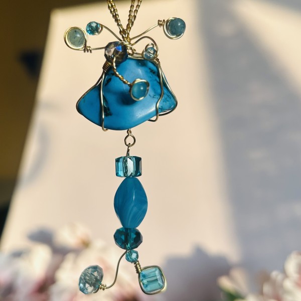 Otrā rotas daļa veidota kā piekariņš ar dažādu formu zilām stikla un kristāla pērlītēm, kas harmoniski turpina tirkīza krāsu gammu. Vieglā kustība un gaismas atspīdumi pērlītēs piešķir rotai elegantu un nedaudz pasakainu noskaņu.