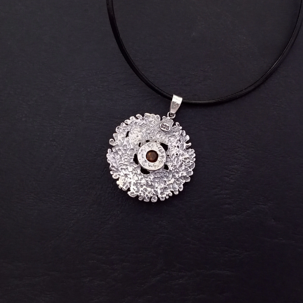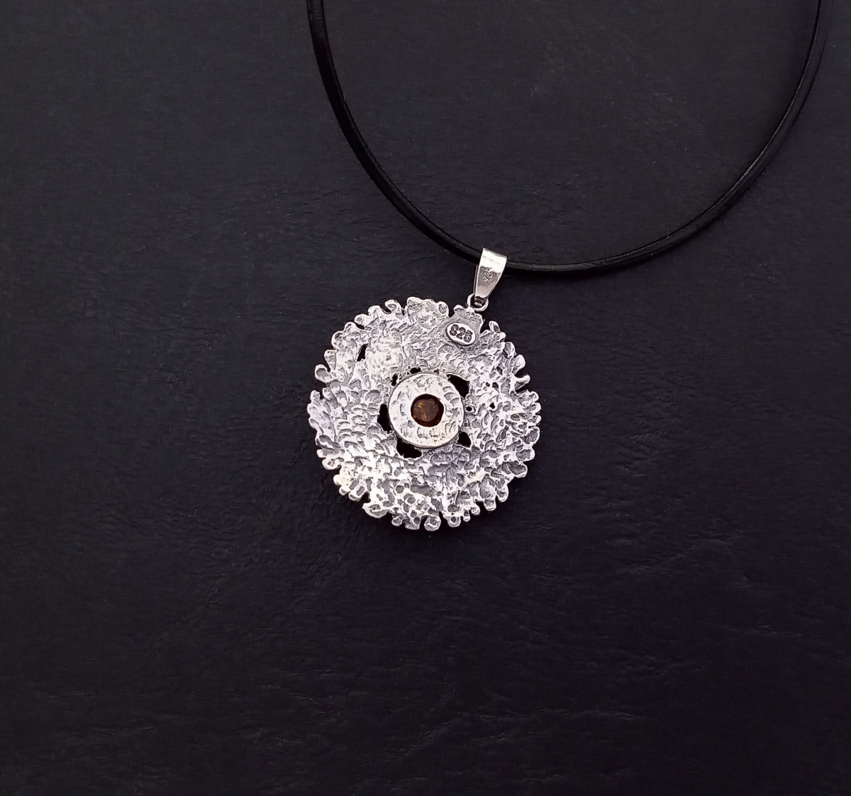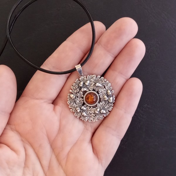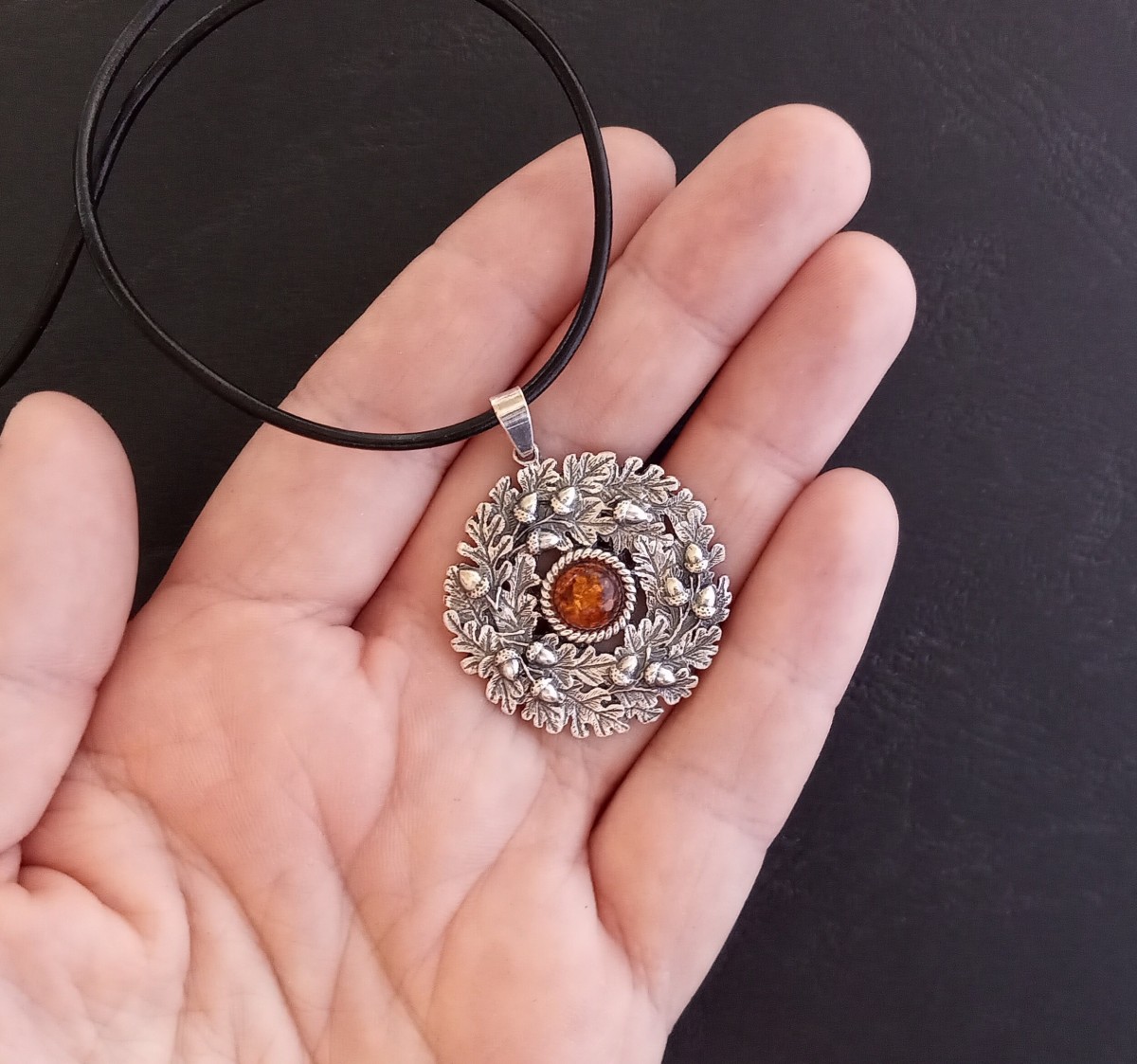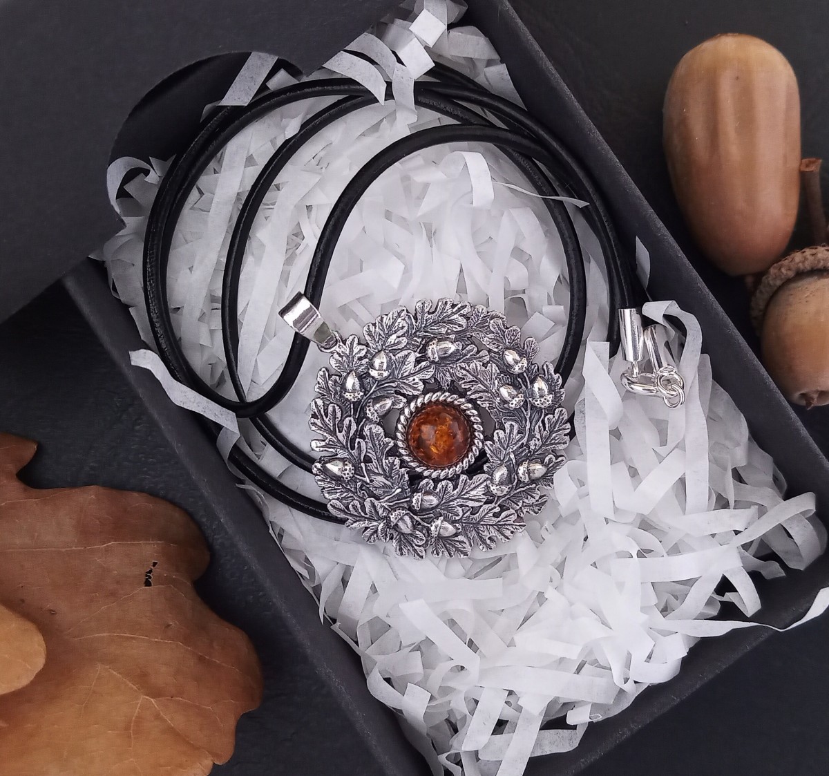Kulons "Ozola lapas" no 925 oksidēta sudraba ar dzintaru.