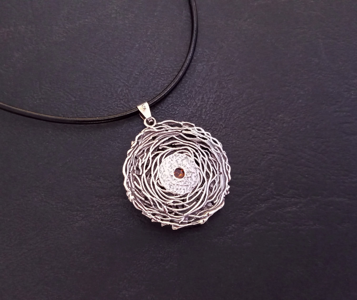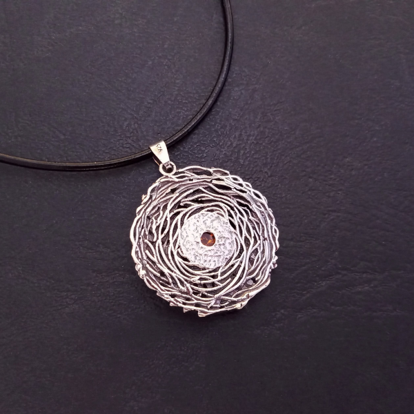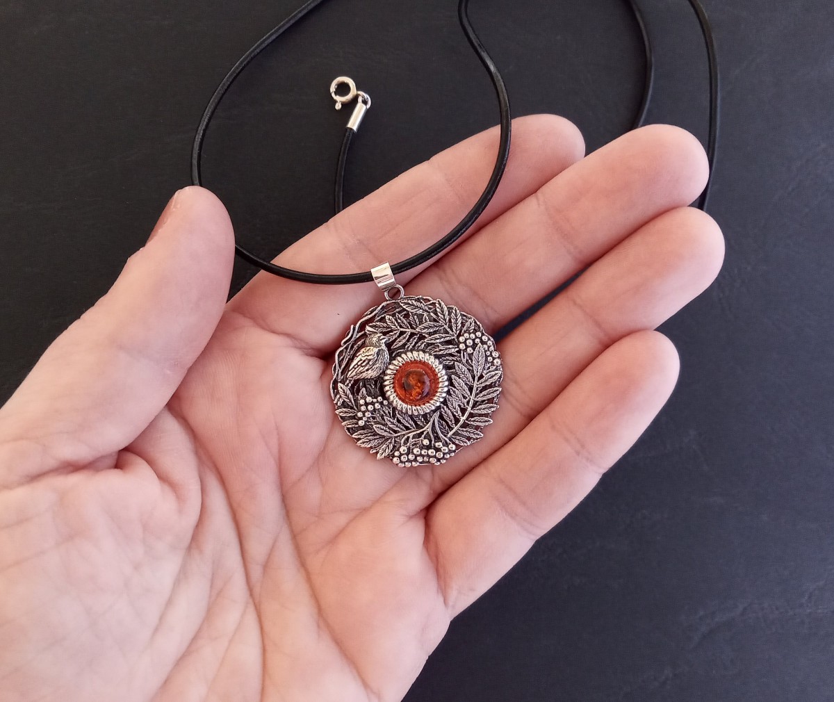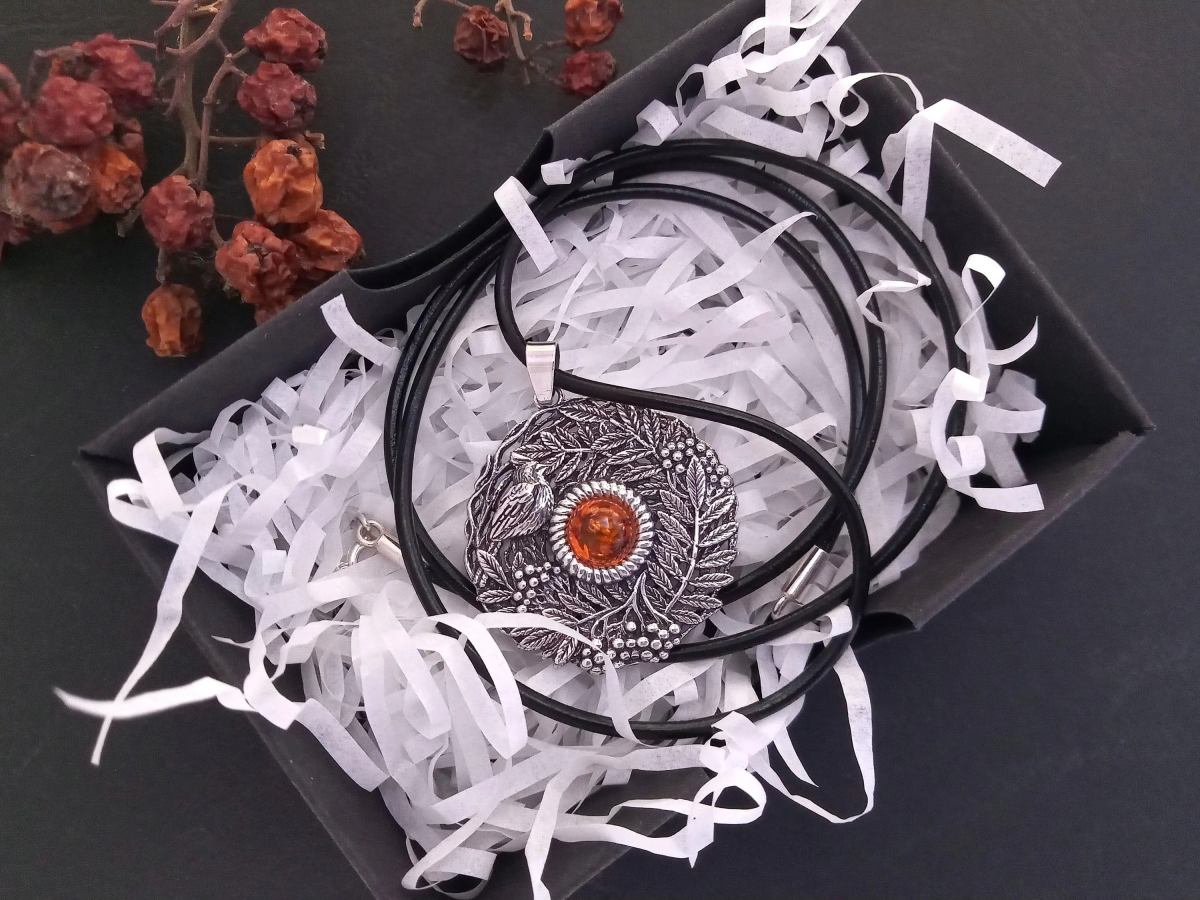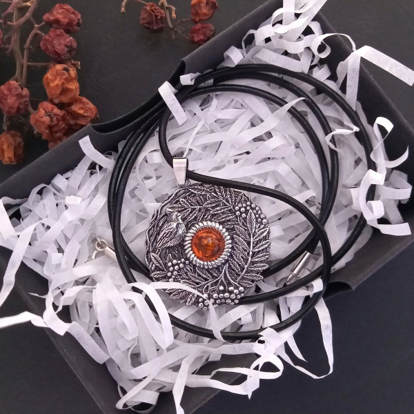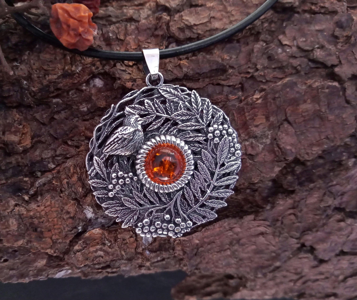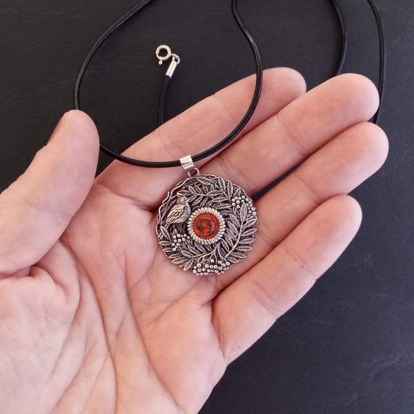 Kulons "Pīlādžu zāri" no 925 oksidēta sudraba ar dzintaru.