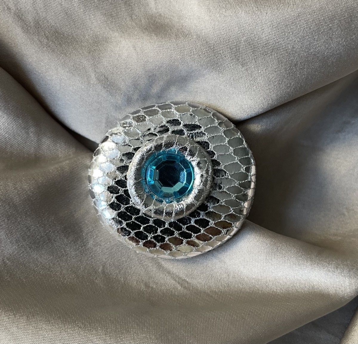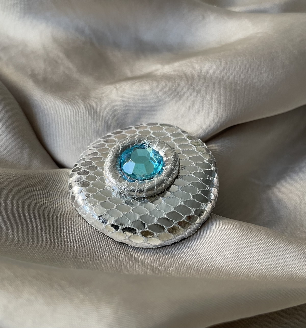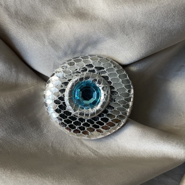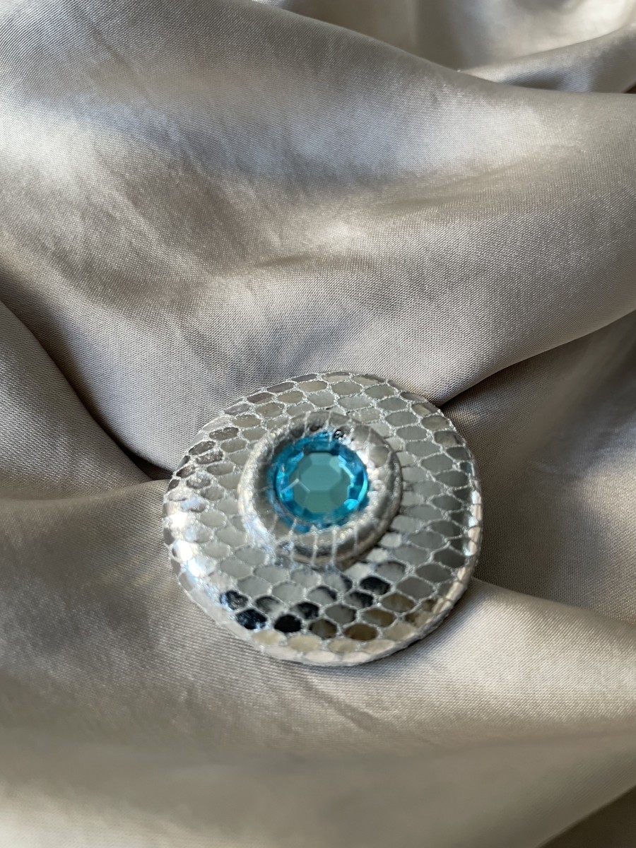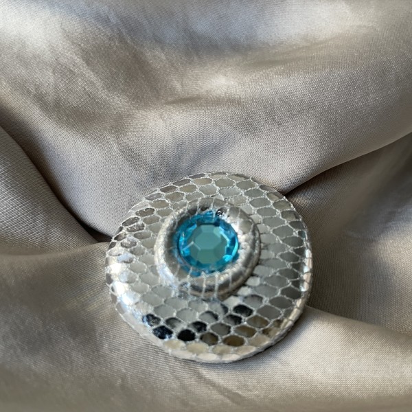 Dabīgas ādas sudrabkrāsas brošiņa (3,8cm x 3,5cm) ar kristāliņu (1cm diametrā)