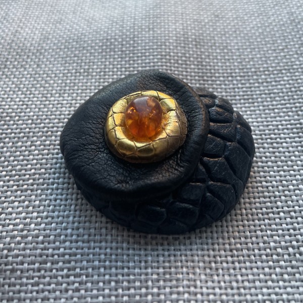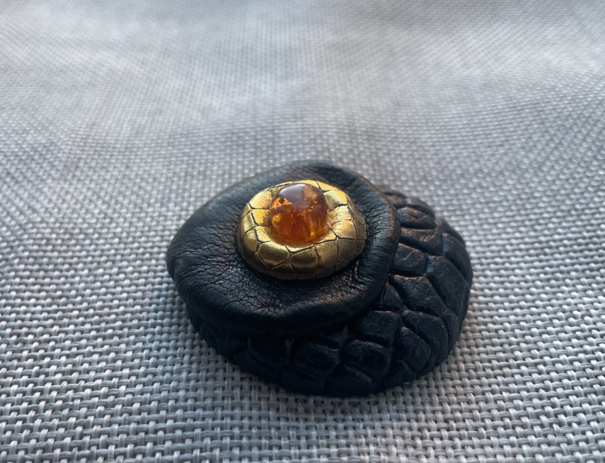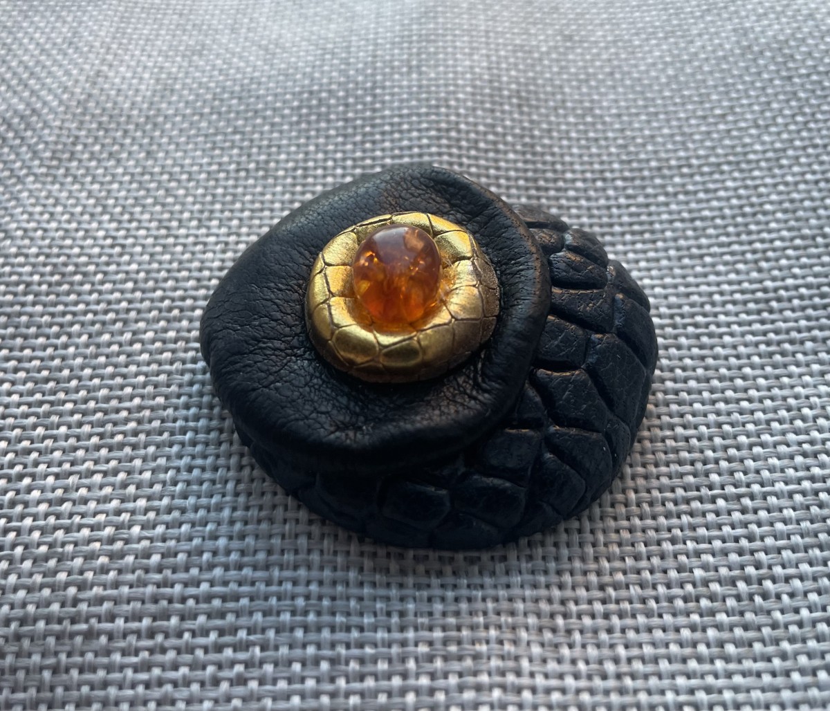 Dabīgas ādas broša (4,7cm diametrā) ar dzintaru (0,9cmx1,2cm)