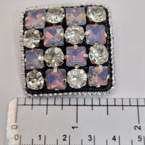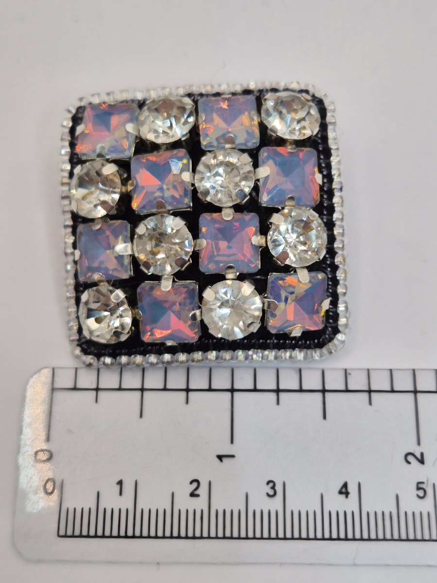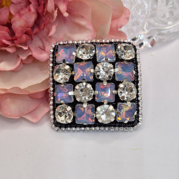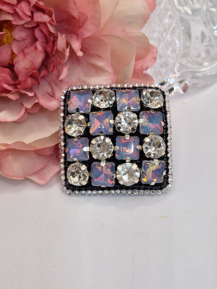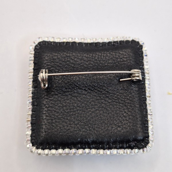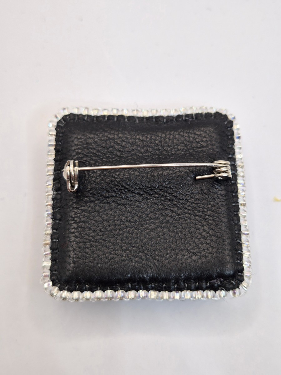 Brošiņa izūta ar Čehu un Japāņu sīkpērlītēm un maziem kristāliem. Otra puse apstrādāta ar dabīgo ādu. Sudrabkrāsas metāla aizdare