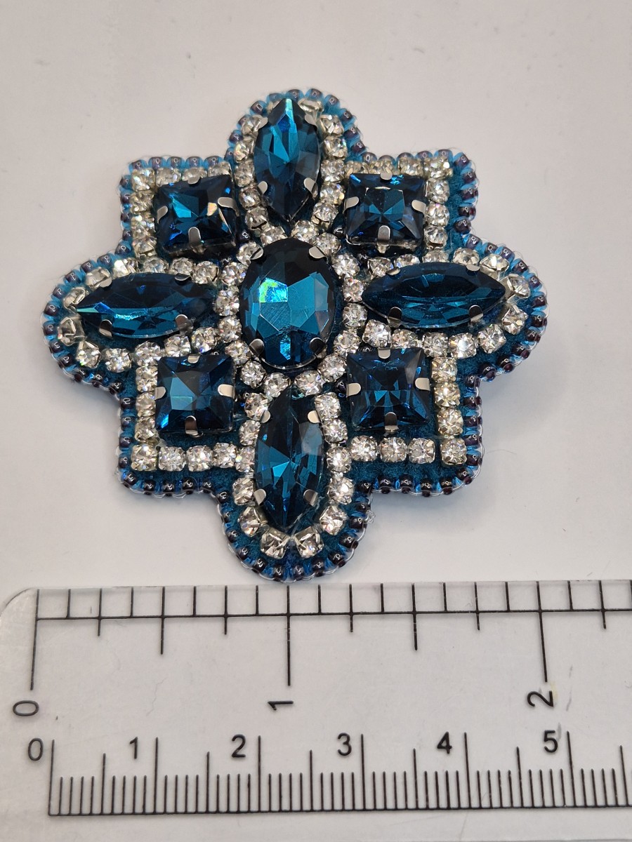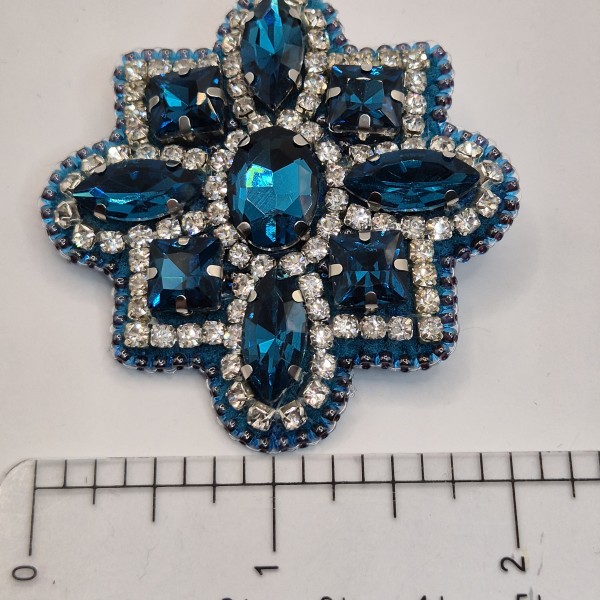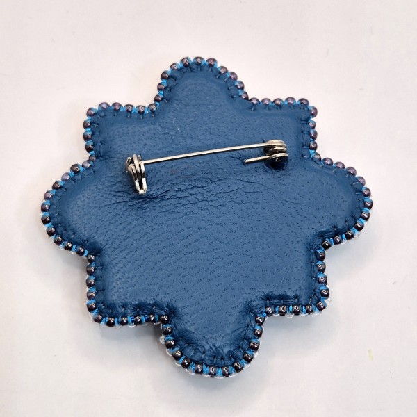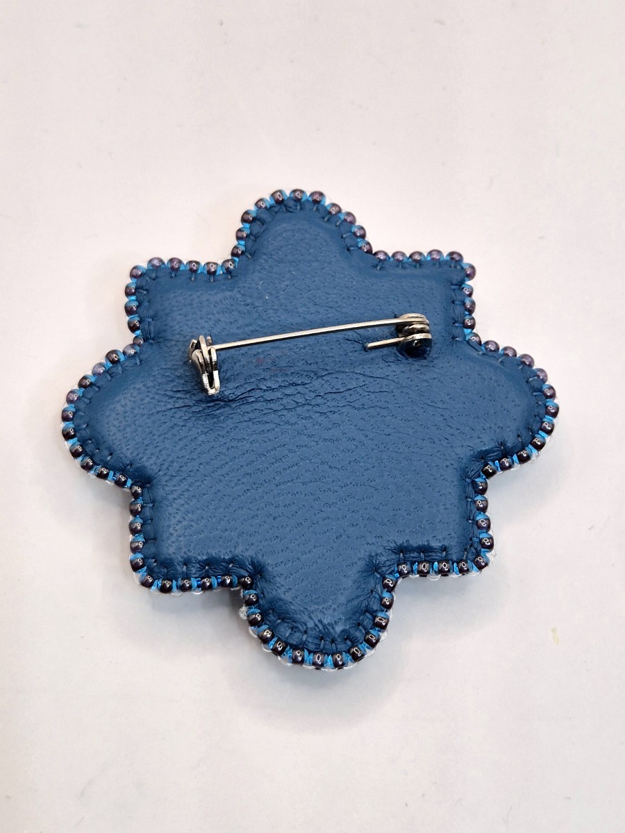 Brošiņa izūta ar Čehu un Japāņu sīkpērlītēm un maziem kristāliem. Otra puse apstrādāta ar dabīgo ādu. Sudrabkrāsas metāla aizdare