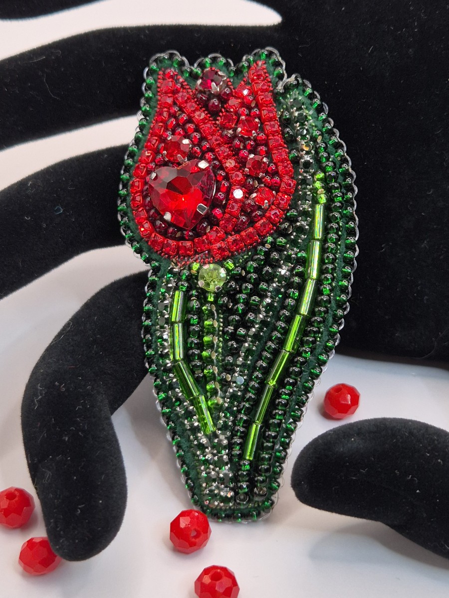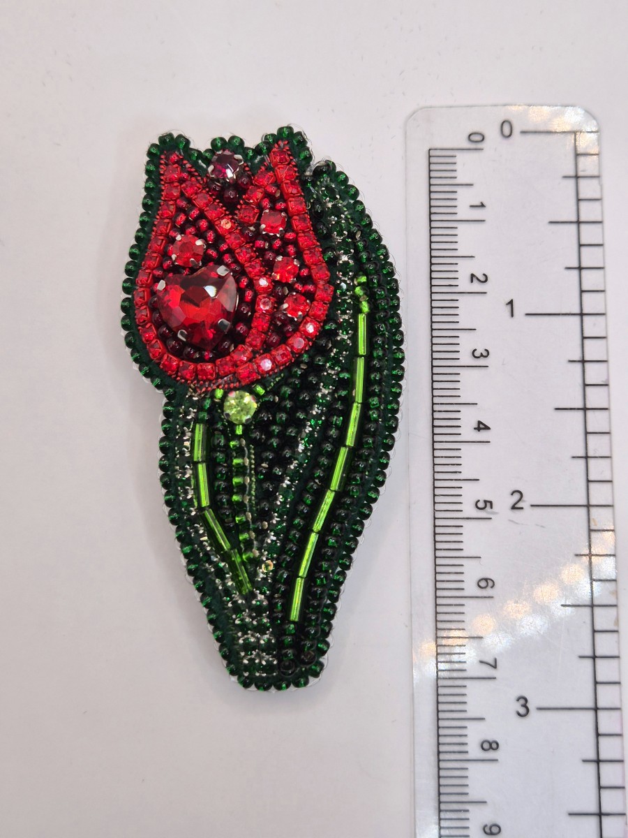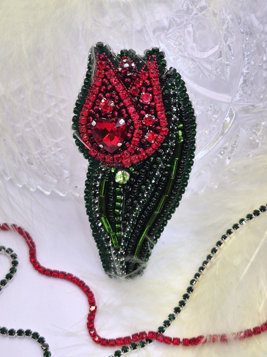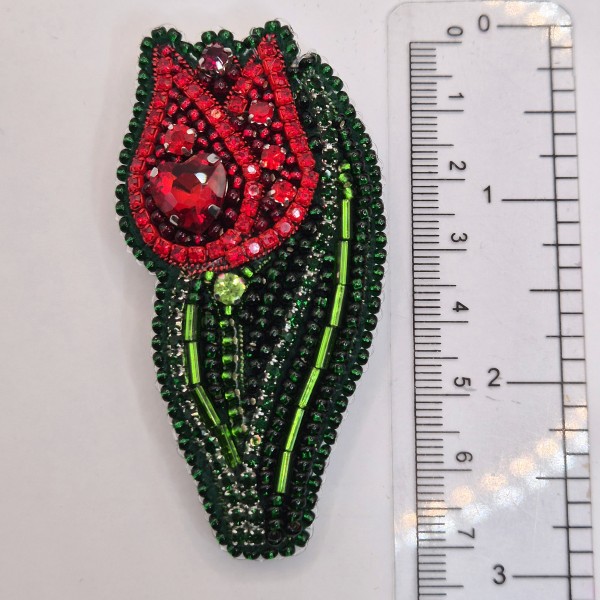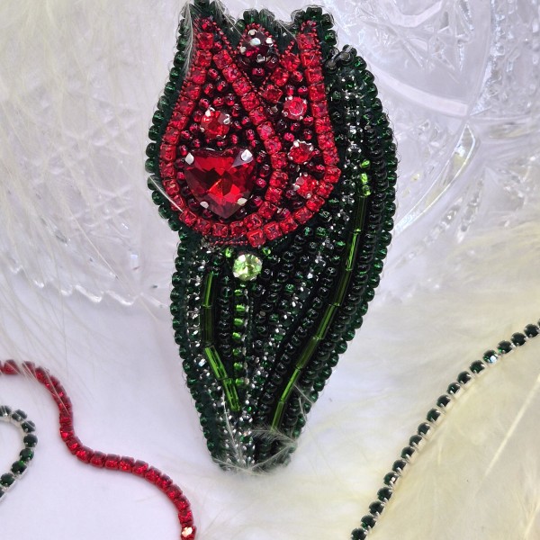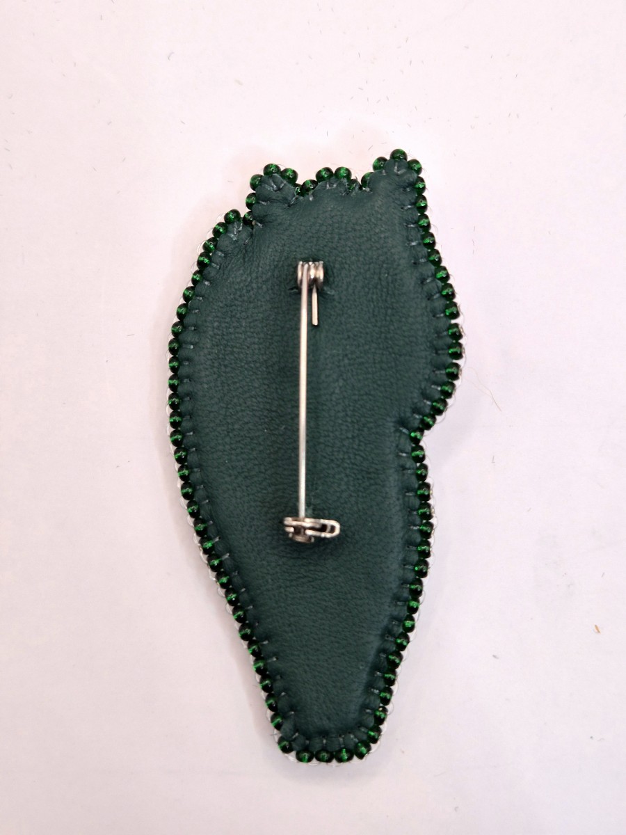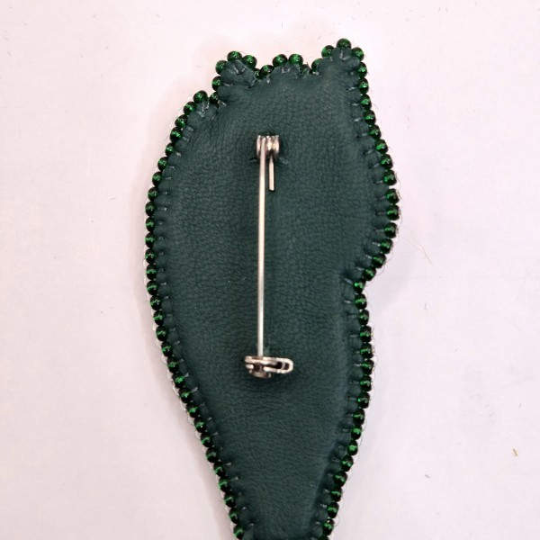 Brošiņa izūta ar Čehu un Japāņu sīkpērlītēm un maziem kristāliem. Otra puse apstrādāta ar dabīgo ādu. Sudrabkrāsas metāla aizdare