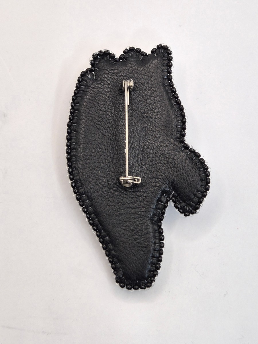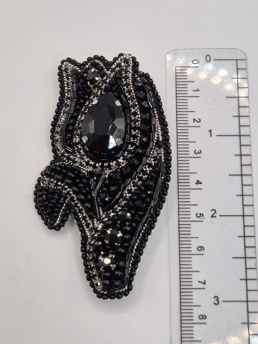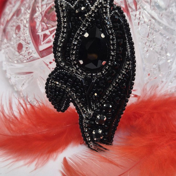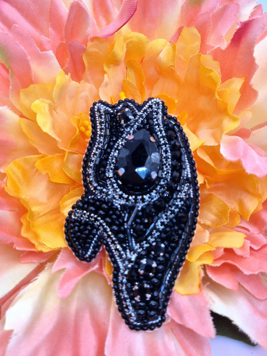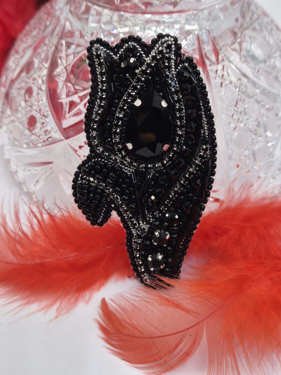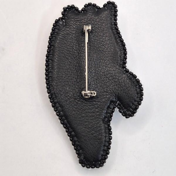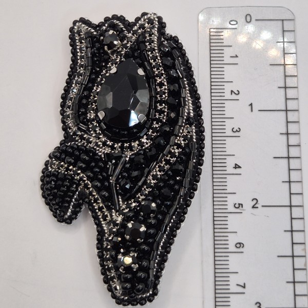 Brošiņa izūta ar Čehu un Japāņu sīkpērlītēm un maziem kristāliem. Otra puse apstrādāta ar dabīgo ādu. Sudrabkrāsas metāla aizdare