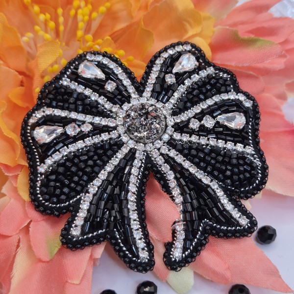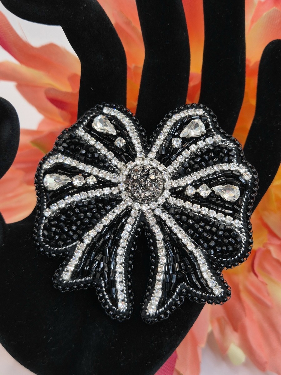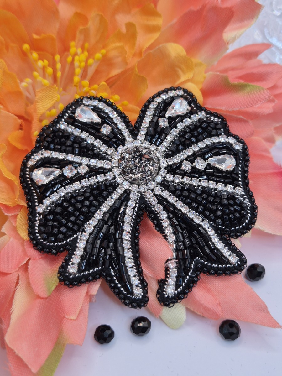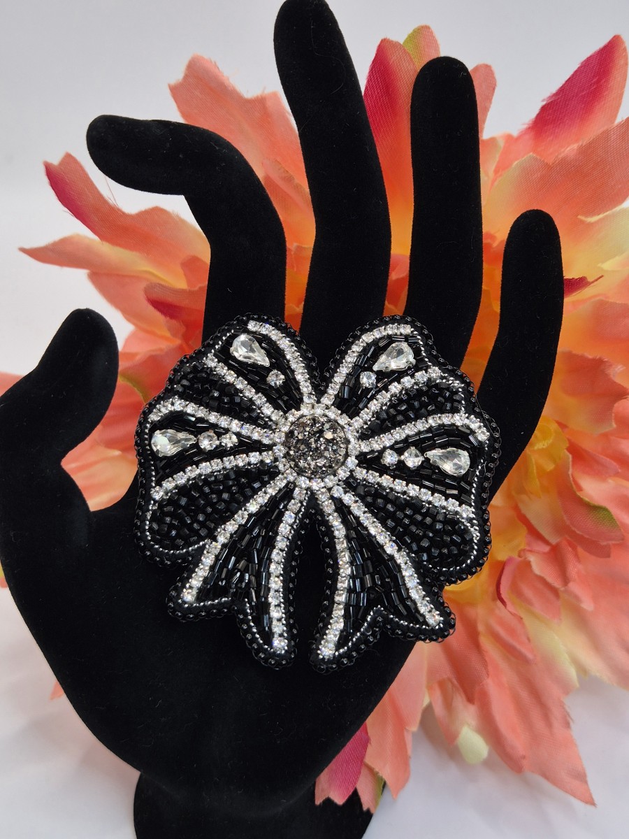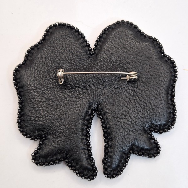 Brošiņa izūta ar Čehu un Japāņu sīkpērlītēm un maziem kristāliem. Otra puse apstrādāta ar dabīgo ādu. Sudrabkrāsas metāla aizdare