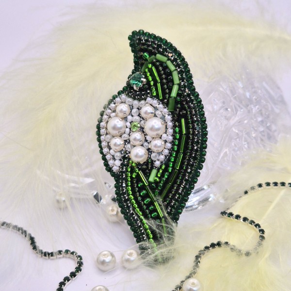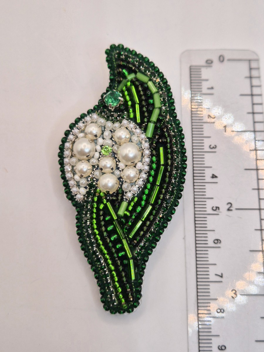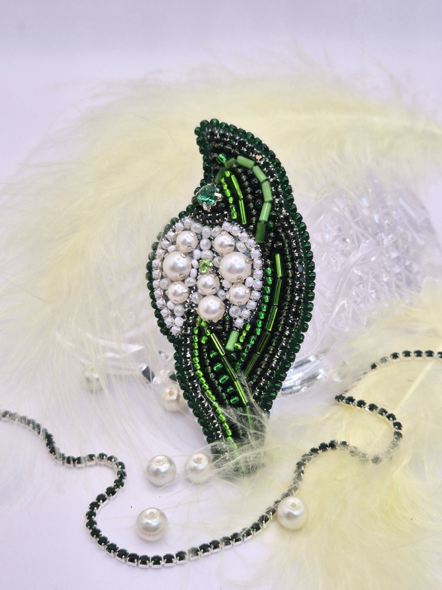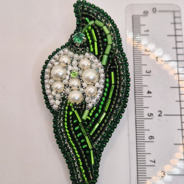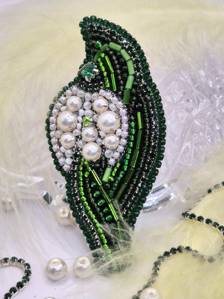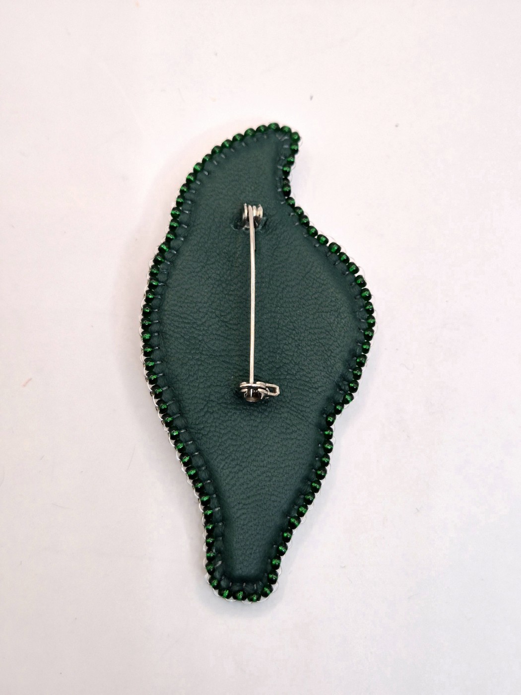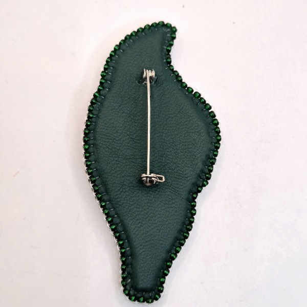 Brošiņa izūta ar Čehu un Japāņu sīkpērlītēm un maziem kristāliem. Otra puse apstrādāta ar dabīgo ādu. Sudrabkrāsas metāla aizdare