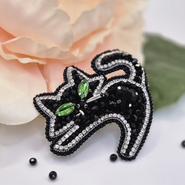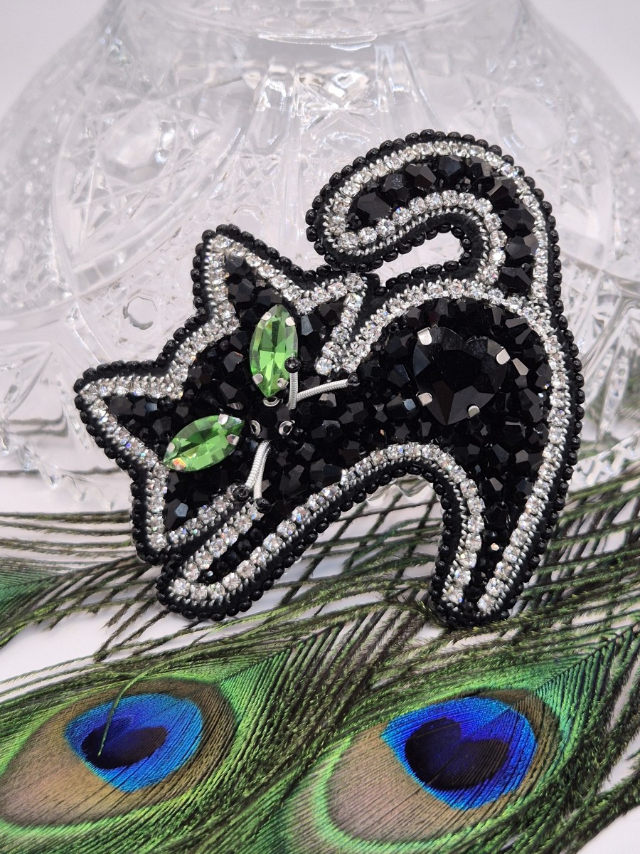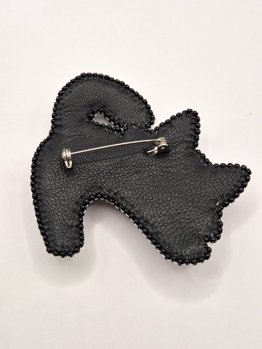 Brošiņa izūta ar Čehu un Japāņu sīkpērlītēm un maziem kristāliem. Otra puse apstrādāta ar dabīgo ādu. Sudrabkrāsas metāla aizdare