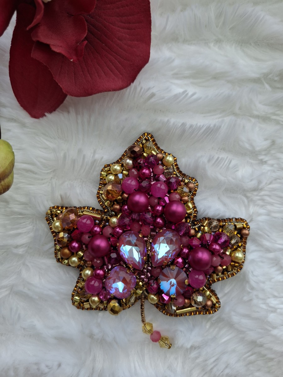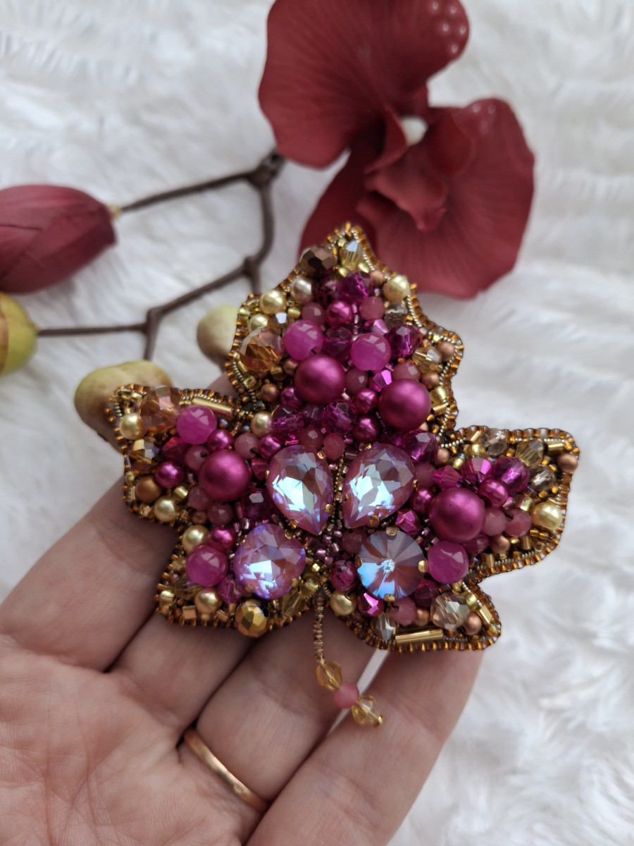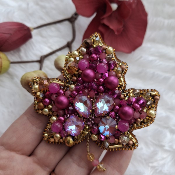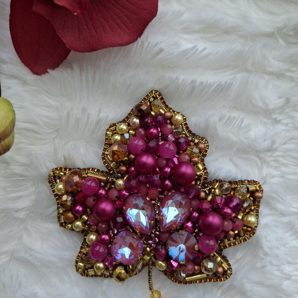 Piespraude kļavas lapiņas formā, lai rudeni sagaidītu koši, krāsaini un gaumīgi. Piespraudes tapšanā izmantotas kristālu virtenes, stikla kristāli, stikla pērles, rondeles, bikonusi un metāla furnitūra.