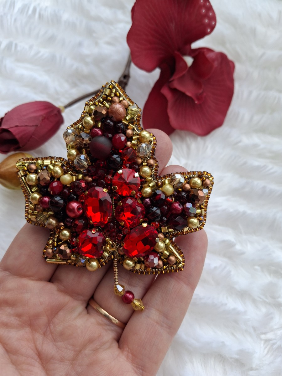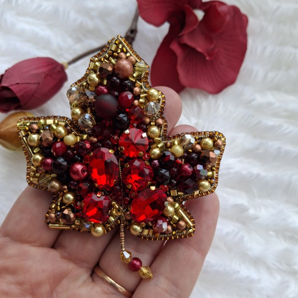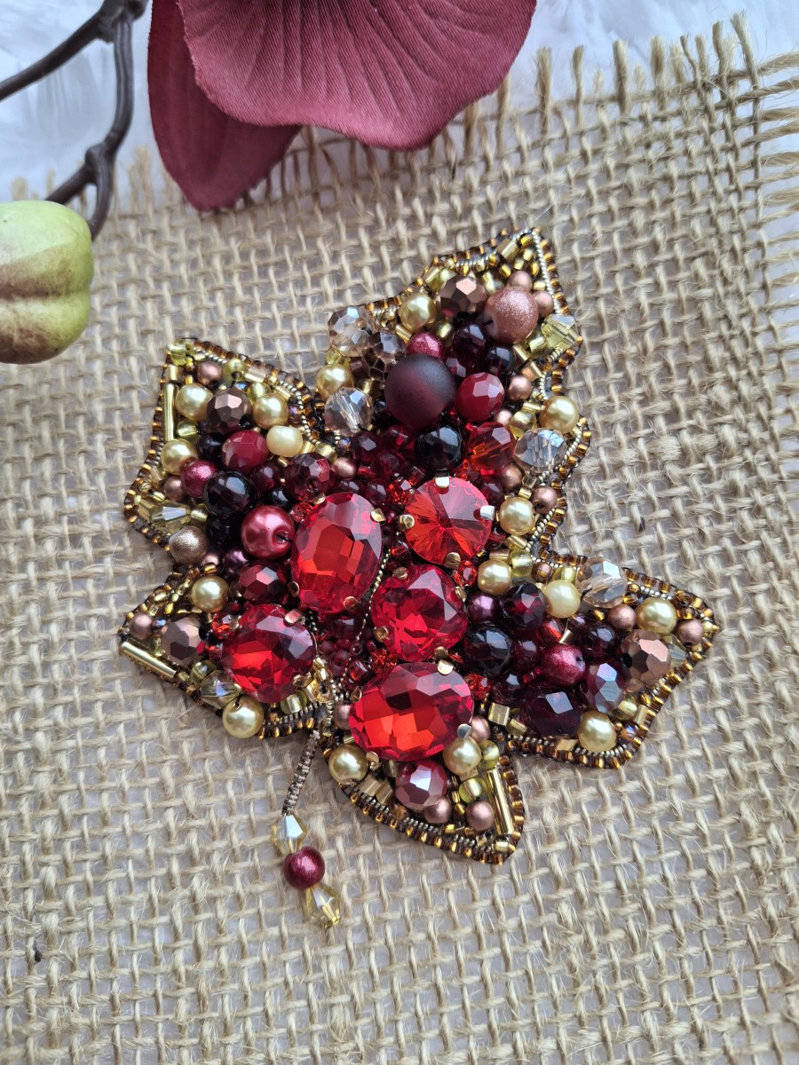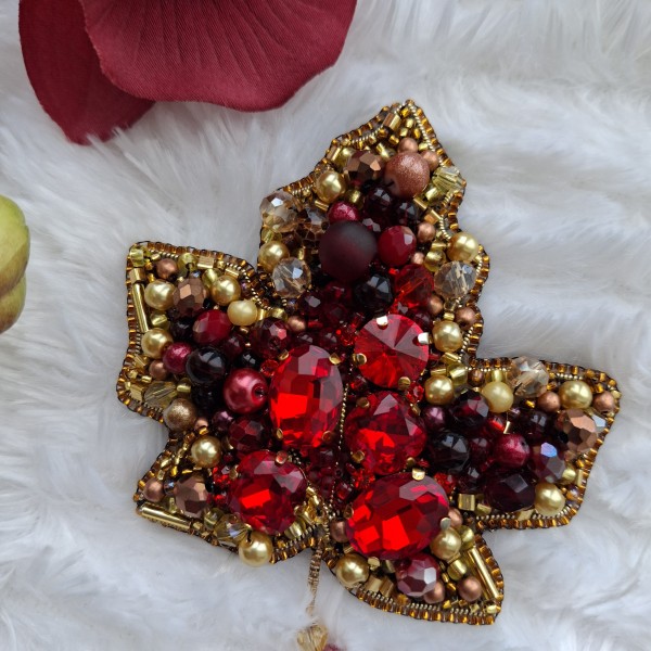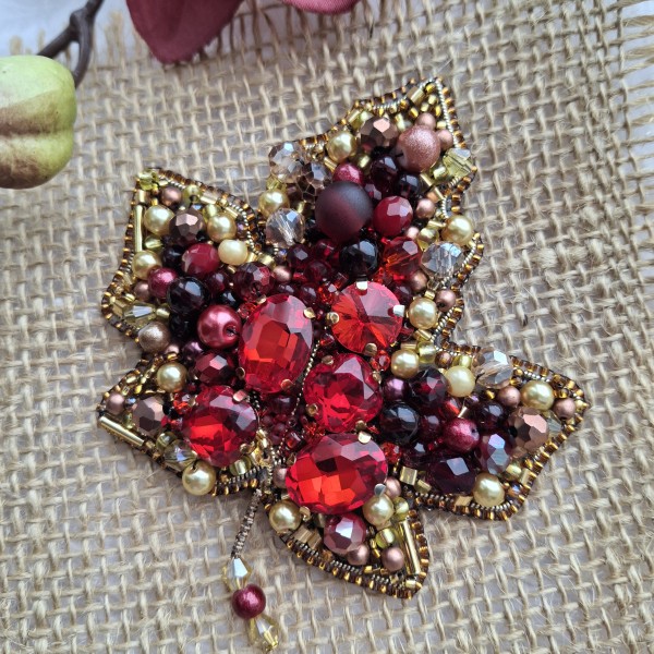 Piespraude kļavas lapiņas formā, lai rudeni sagaidītu koši, krāsaini un gaumīgi. Piespraudes tapšanā izmantotas kristālu virtenes, stikla kristāli, stikla pērles, rondeles, bikonusi un metāla furnitūra.