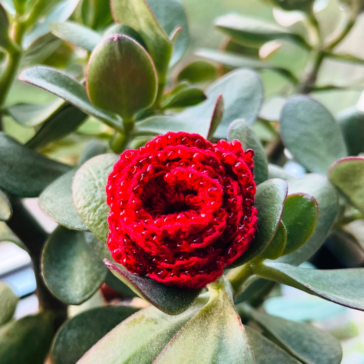 Tamborēta brošiņa “Rozīte”, dekorēta ziedlapiņu maliņa ar pērlītēm.