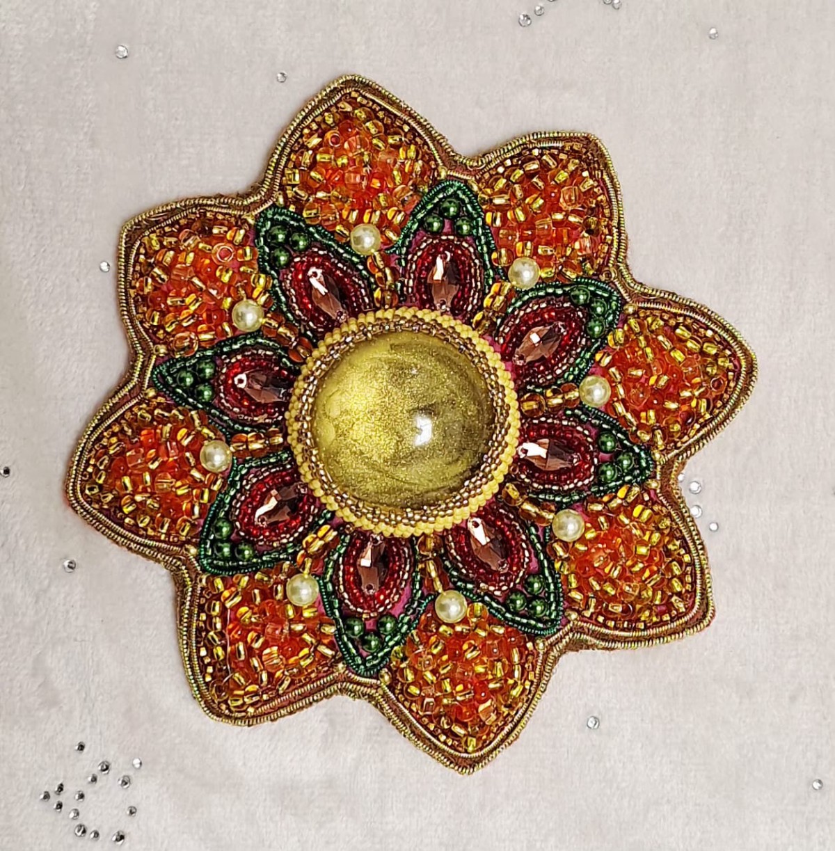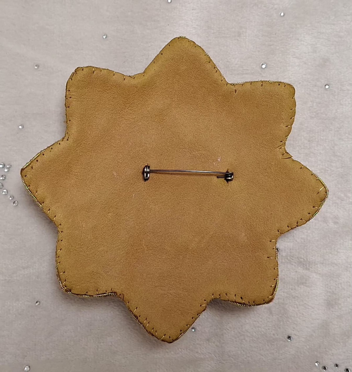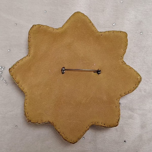 Piespraude izgatavota no Čehu stikla pērlītēm, akrila pērlītēm (Ķīna), dabīgā āda, filcs, kabošans izgatavots no epoksīda sveķiem. Izmērs 15x12 cm, svars 83 grami. Piespraudi var nēsāt uz tādiem apģērbiem piemēram kā jakas, virsjakas, mēteļi, adīti lakati u.tml. Izmērs - D 13 cm, svars 70 grami. Piespraudi var nēsāt uz tādiem apģērbiem kā jakas, virsjakas, mēteļi, adīti lakati u.tml.