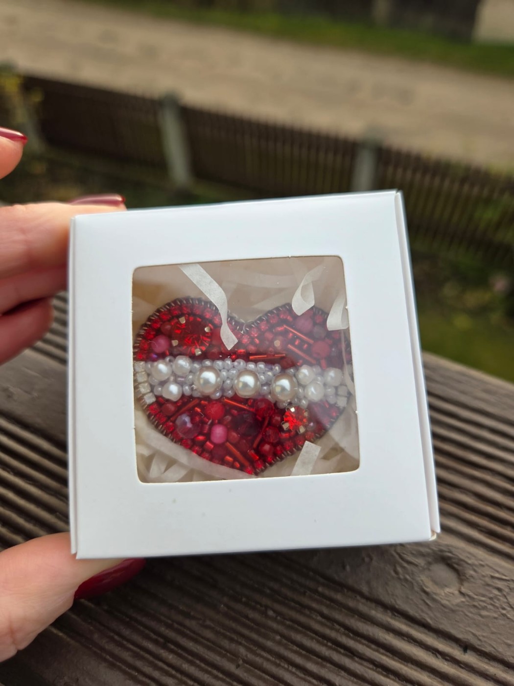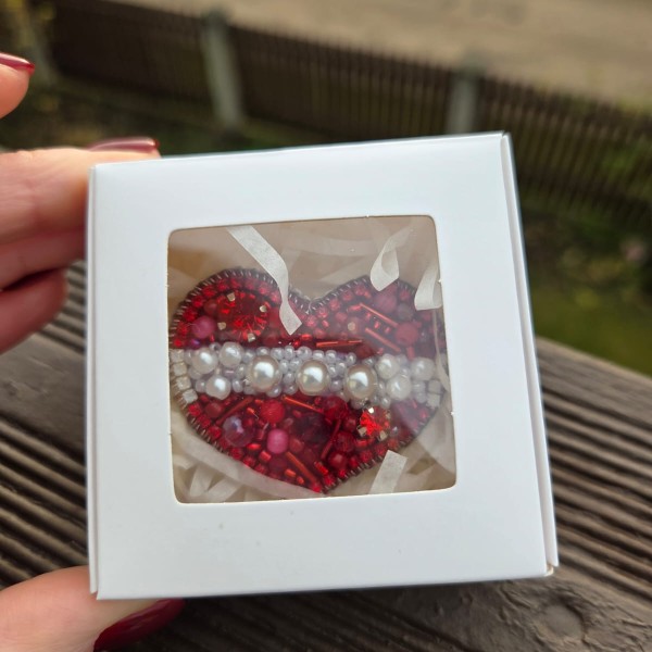 Ar rokām no dažādām pērlītēm šūta piespraude 4 x 5cm. Aizmugurē- mākslīgā āda. Nerūsējošā tērauda aizdare.