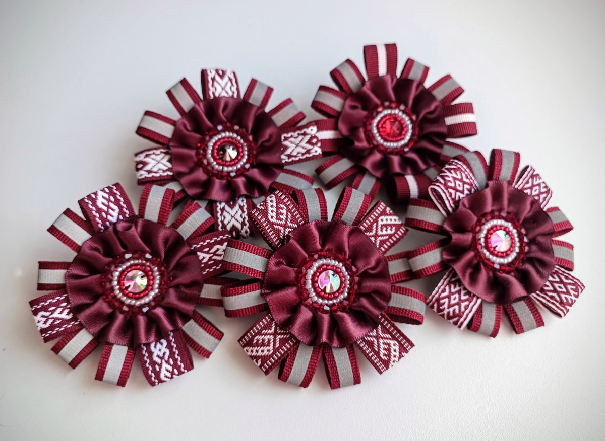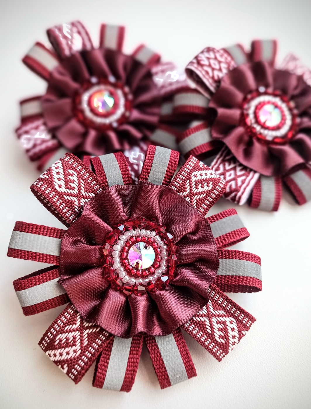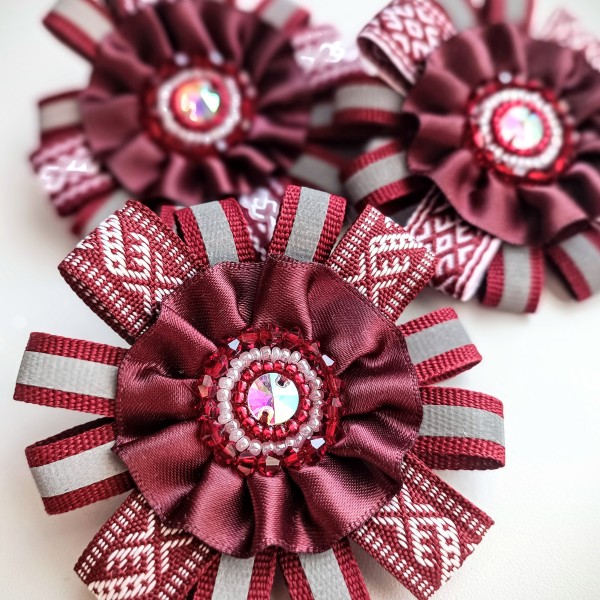 * Piespraude izgatavota no karoga un etnogrāfiskās lentas, atlasa lentas, gaismu atstarojošas lentas, stikla kabašona un pērlītēm, metāla aizdares.