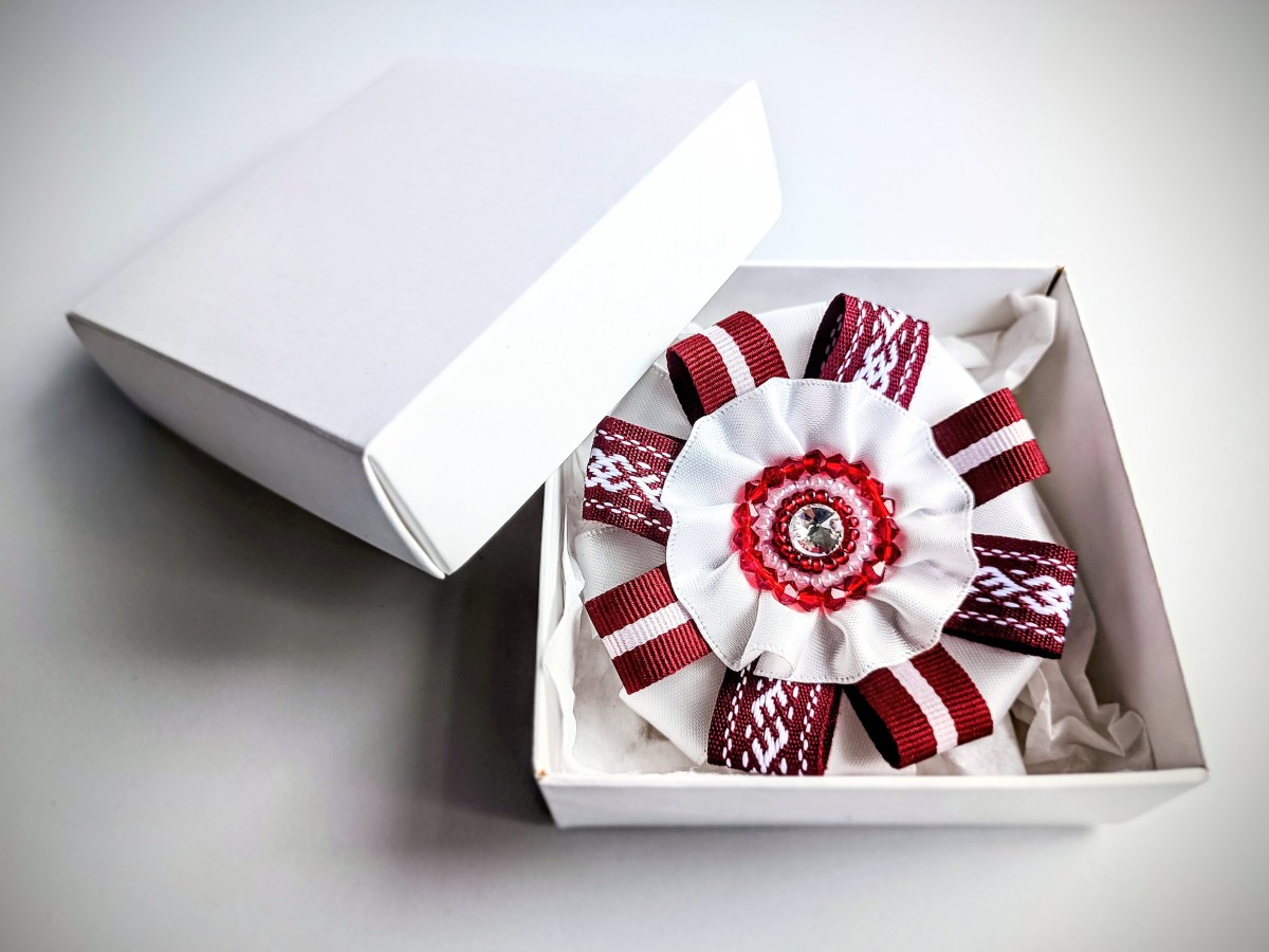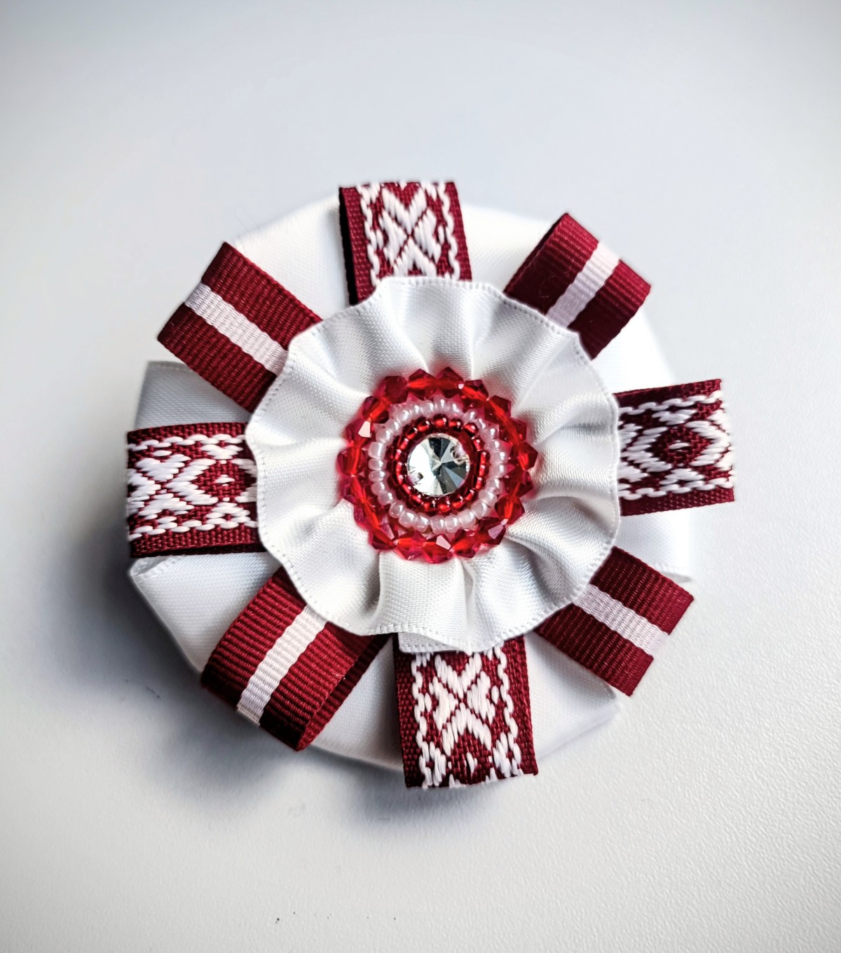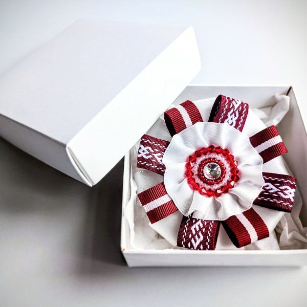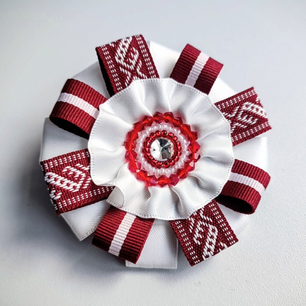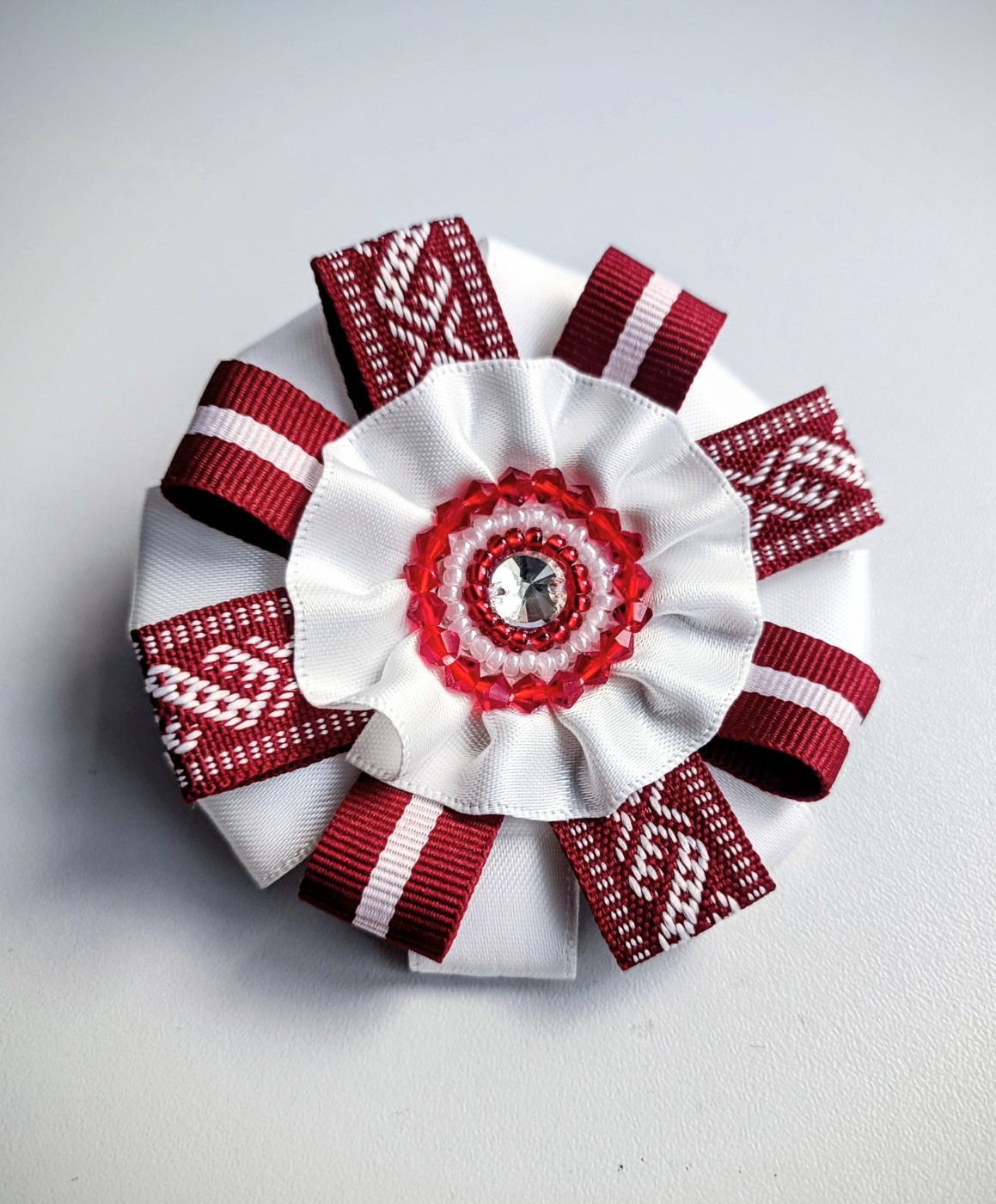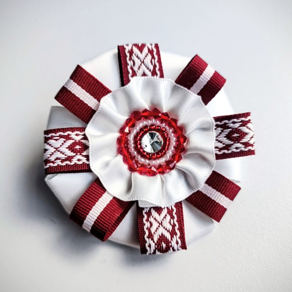 * Piespraude izgatavota no karoga un etnogrāfiskās lentas, atlasa lentas, stikla kabašona un pērlītēm, metāla aizdares.