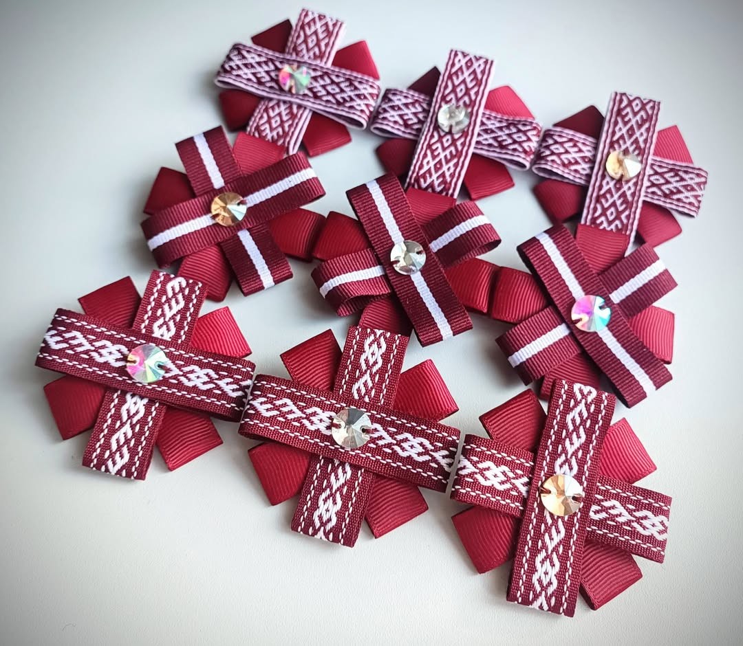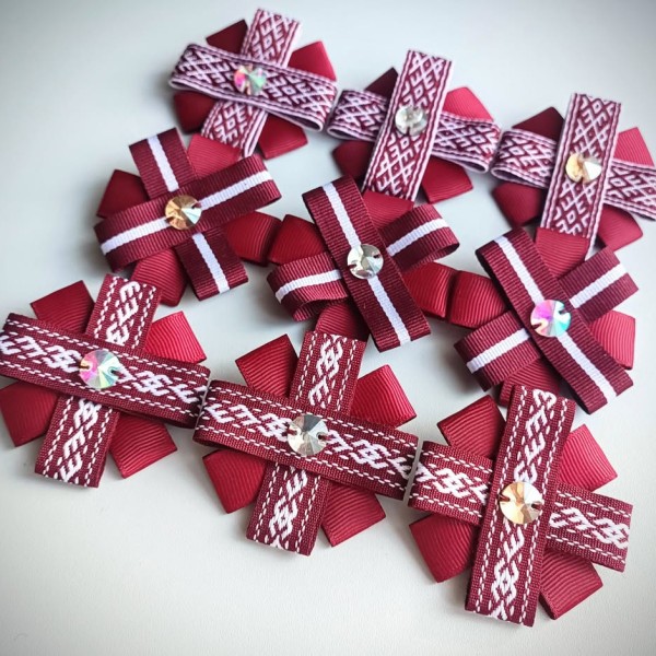 * Piespraude izgatavota no karoga, etnogrāfiskās lentas, lentas, stikla kabašona, koka pogas, metāla pogas, metāla aizdares.