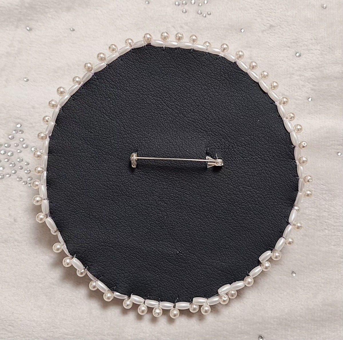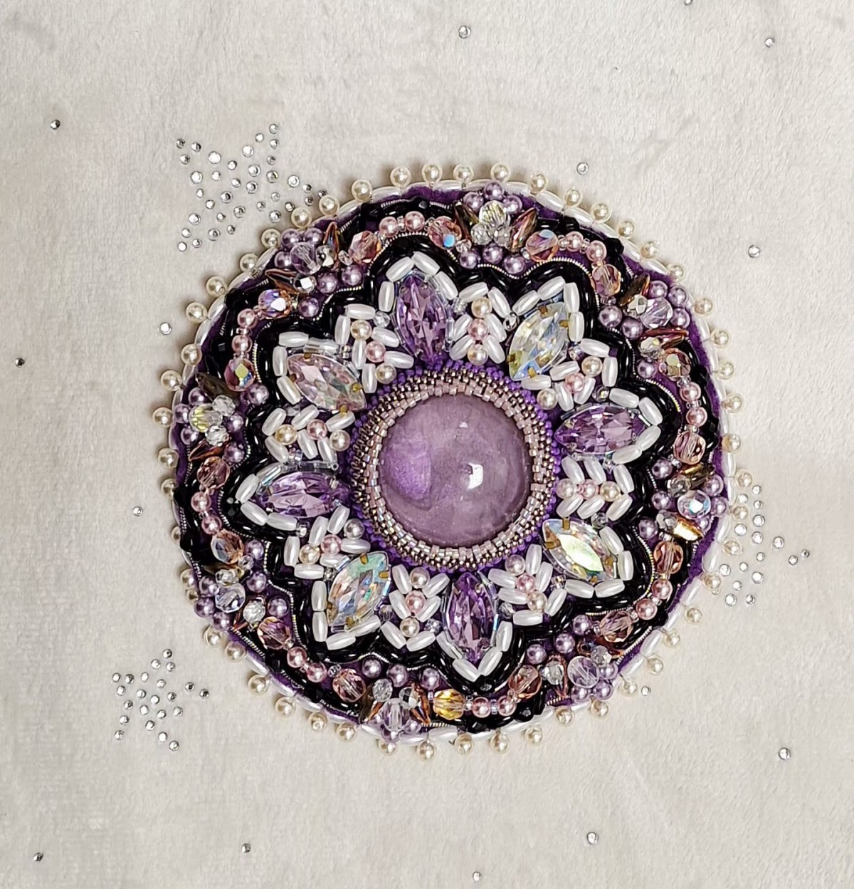 Piespraude - mandala izgatavota no stikla un akrila pērlītēm (Čehija, Ķīna), filca, EKO ādas, tērauda piespraude, kabašons izgatavots no epoksīda sveķiem. Izmērs - D 12 cm, svars 72 grami. Piespraude svara dēļ vairāk būs piemērota uz tādiem apģērbiem kā jakas, virsjakas, mēteļi, adīti lakati u.tml.