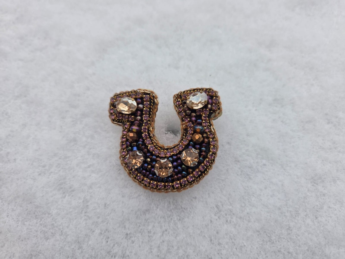 Ar rokām no dažādām pērlītēm šūta piespraude 3,5 x 3,5 cm. Aizmugurē- mākslīgā āda. Nerūsējošā tērauda aizdare.