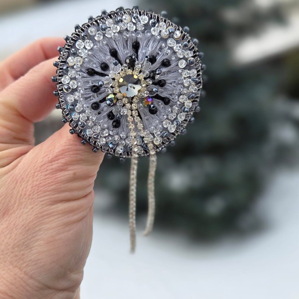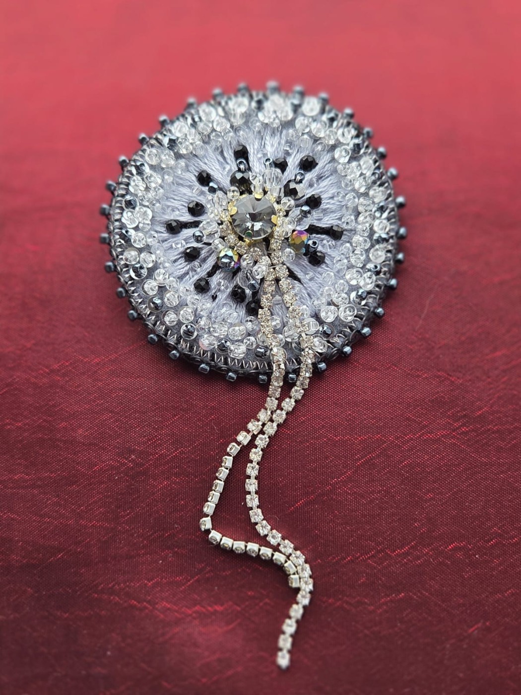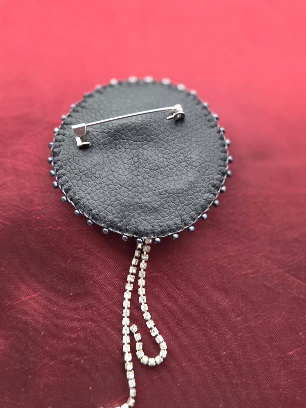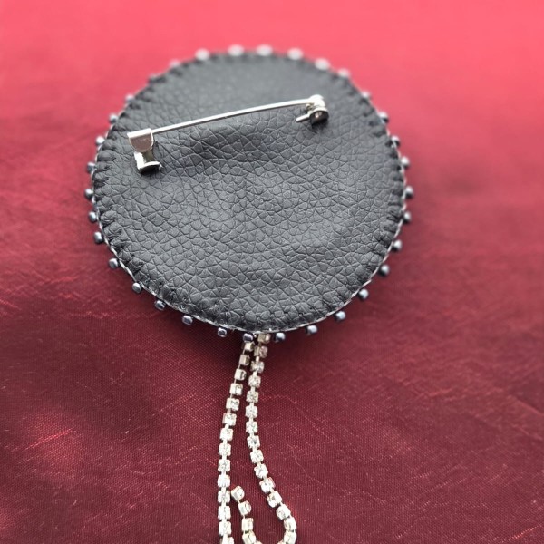Ar rokām no dažādām pērlītēm šūta piespraude, diametrs- 5cm. Aizmugurē- mākslīgā āda. Nerūsējošā tērauda aizdare.