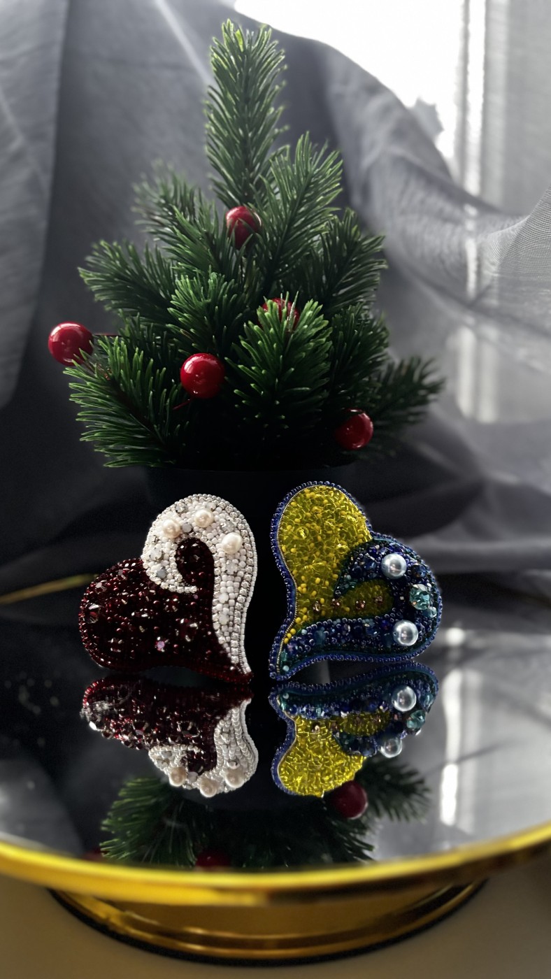 Skaista pašdarināta piespraude (6,5 cm x 6,5 cm), kas izšūta ar japāņu sīkpērlītēm, kristāliem un pērlēm. Aizmugurē apstrādāta ar mākslīgo ādu. Tā var būt lieliskā dāvana sev vai kādam īpašām cilvēkām.