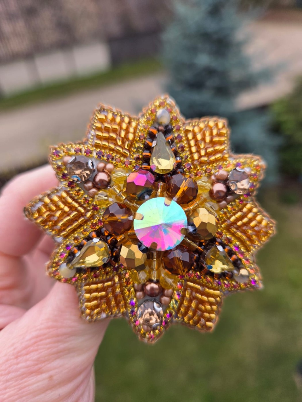 Ar rokām no dažādām pērlītēm šūta piespraude 6 x 6cm. Aizmugurē- mākslīgā āda. Nerūsējošā tērauda aizdare.