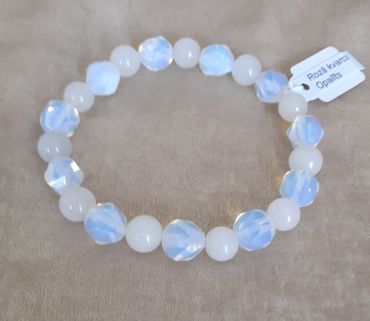 Aproce izgatavota no 8mm rozā kvarca un opalīta pērlītēm, kas vērtas uz elastīgas gumijas.