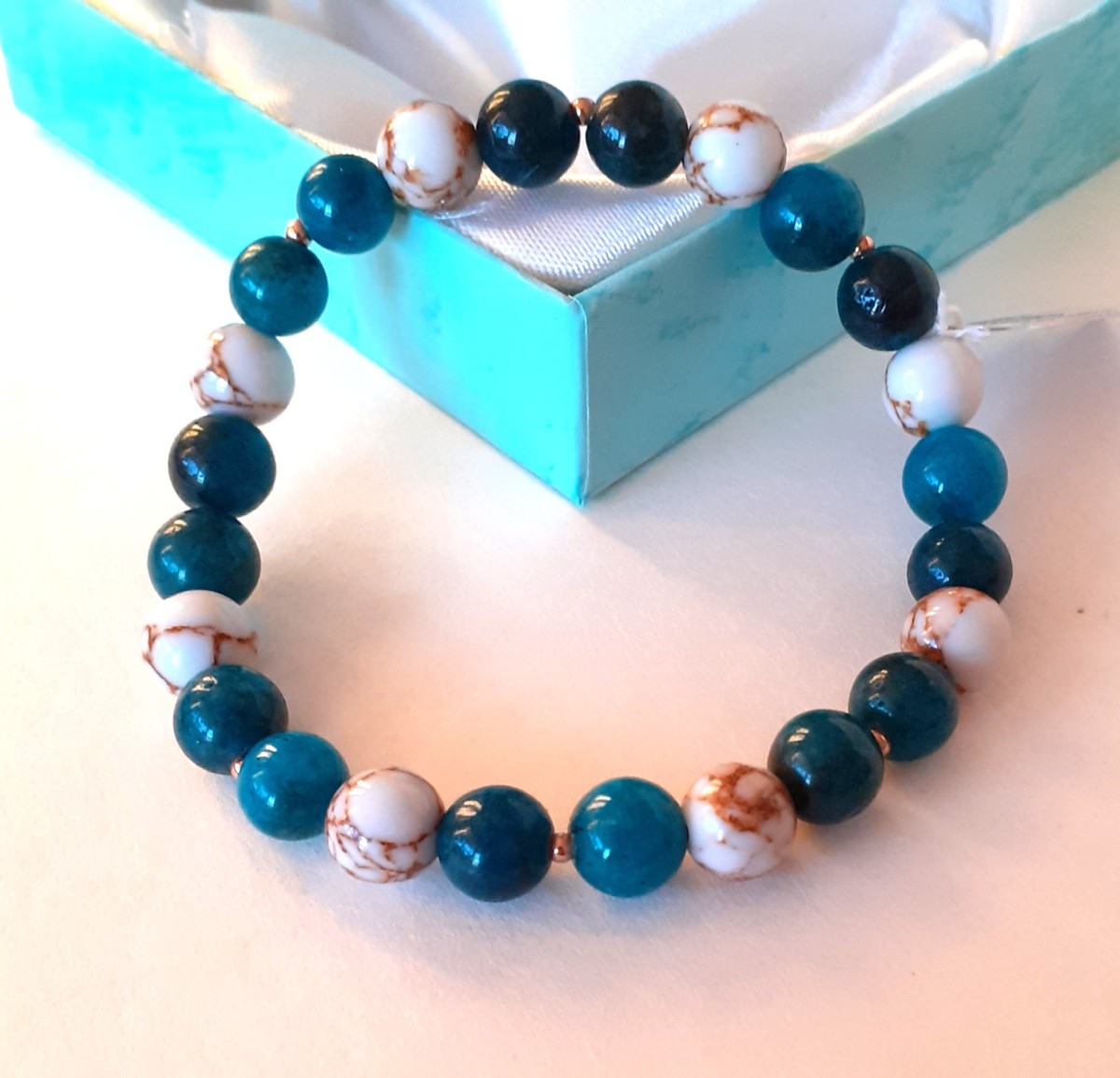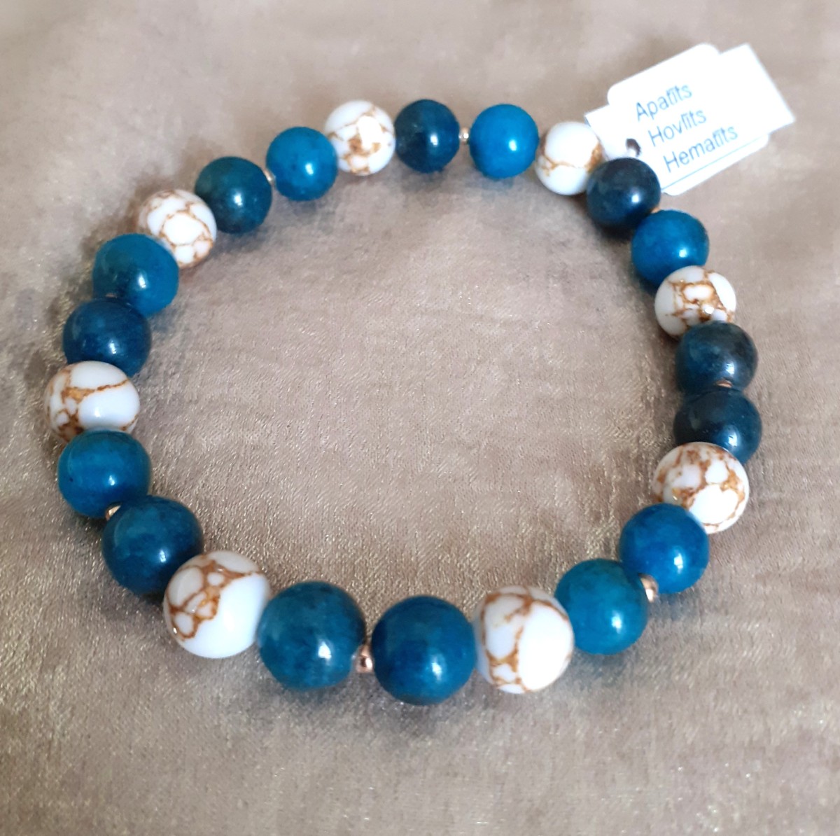 Aproce izgatavota no 8mm apatīta, hovlīta un 2mm zelta krāsas hematīta pērlītēm, kas vērtas uz elastīgas gumijas.