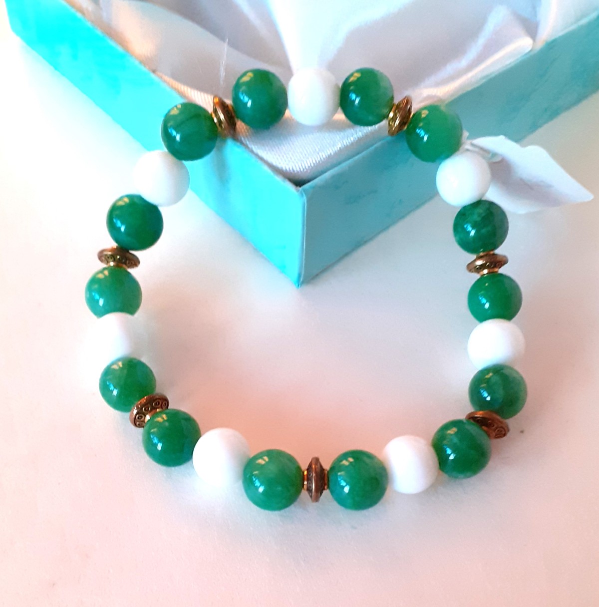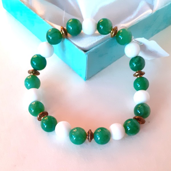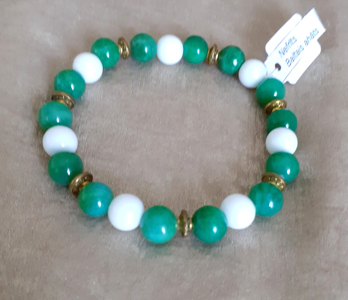 Aproce izgatavota no 8mm nefrīta, baltā ahāta pērlītēm un nerūsējoša metāla detaļām, kas vērtas uz elastīgas gumijas.