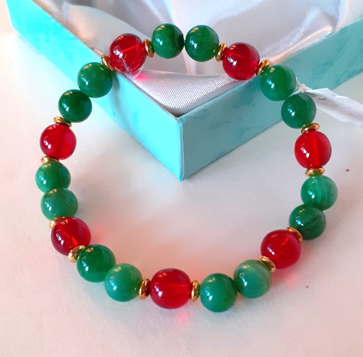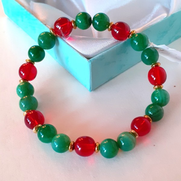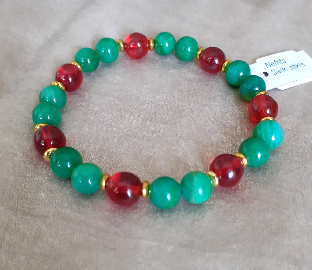 Aproce izgatavota no 8mm nefrīta, sarkana stikla pērlītēm un nerūsējoša metāla detaļām, kas vērtas uz elastīgas gumijas.