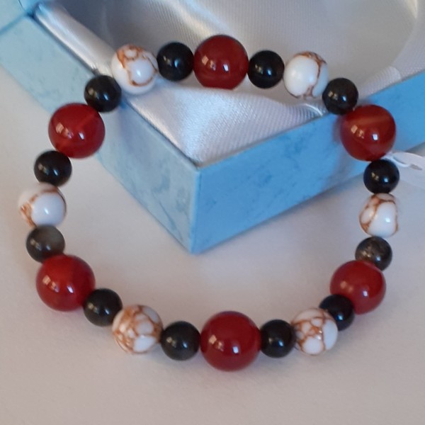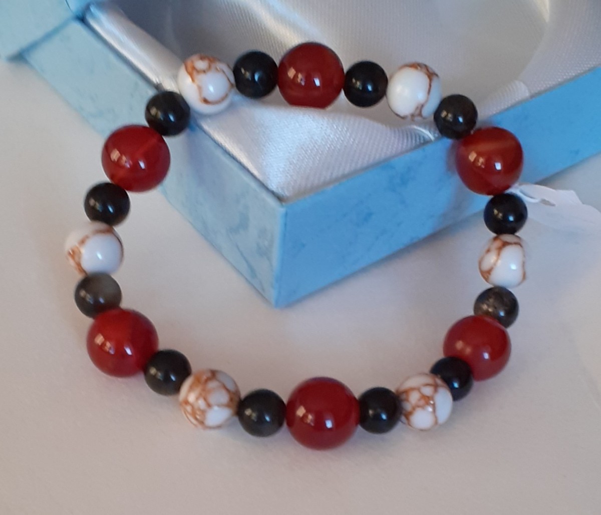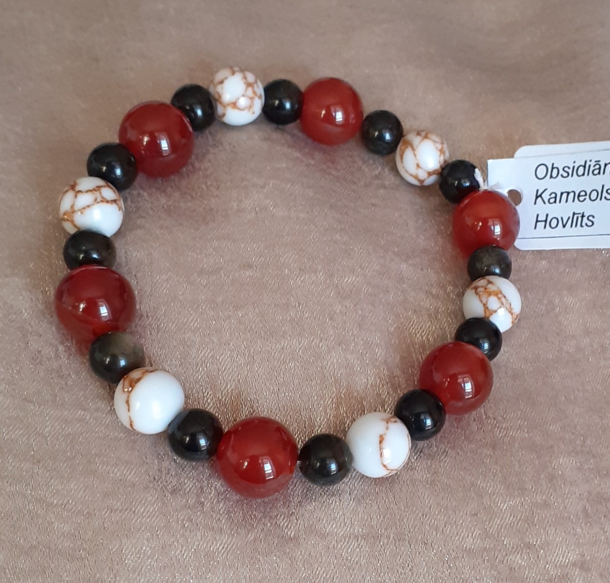 Aproce izgatavota no 10mm karneola, 8mm hovlīta un 4mm obsidiāna pērlītēm, kas vērtas uz elastīgas gumijas.