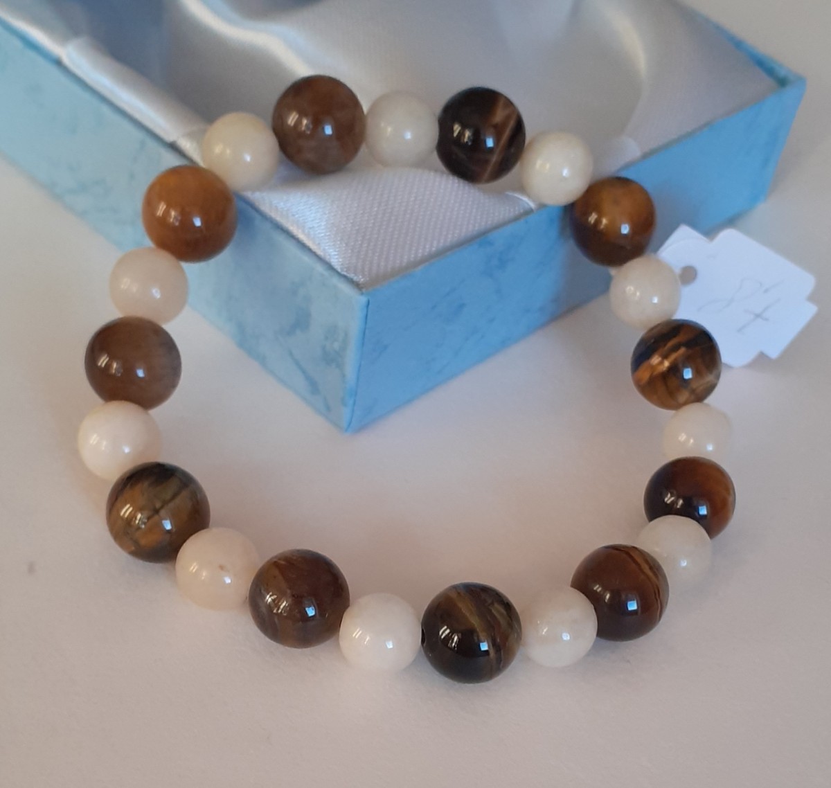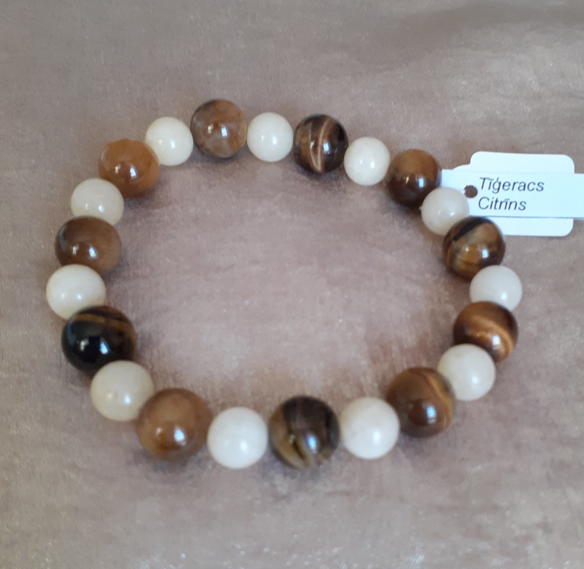 Aproce izgatavota no 10mm tīģeracs un 8mm citrīna pērlītēm, kas vērtas uz elastīgas gumijas.