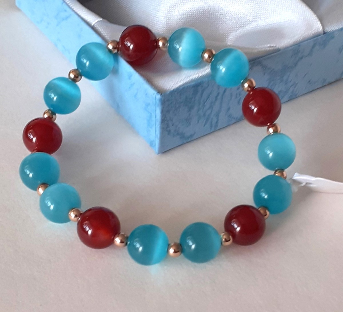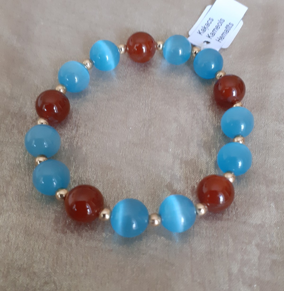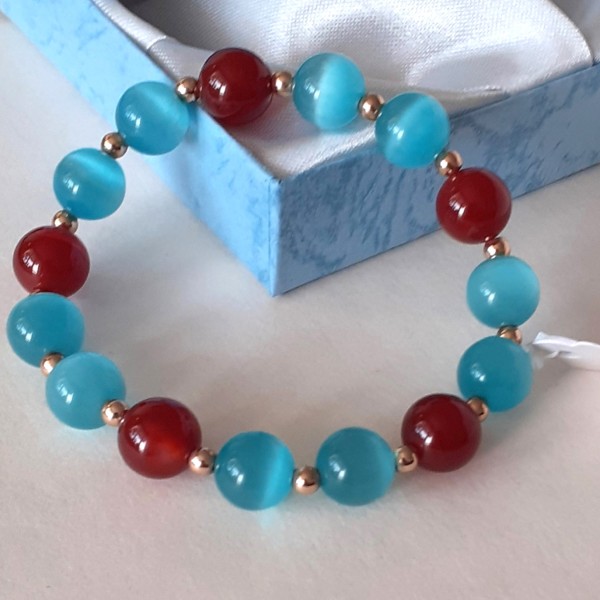 Aproce izgatavota no 10mm zilās kaķacs, karneola un 3mm zelta krāsas hematīta pērlītēm, kas vērtas uz elastīgas gumijas.