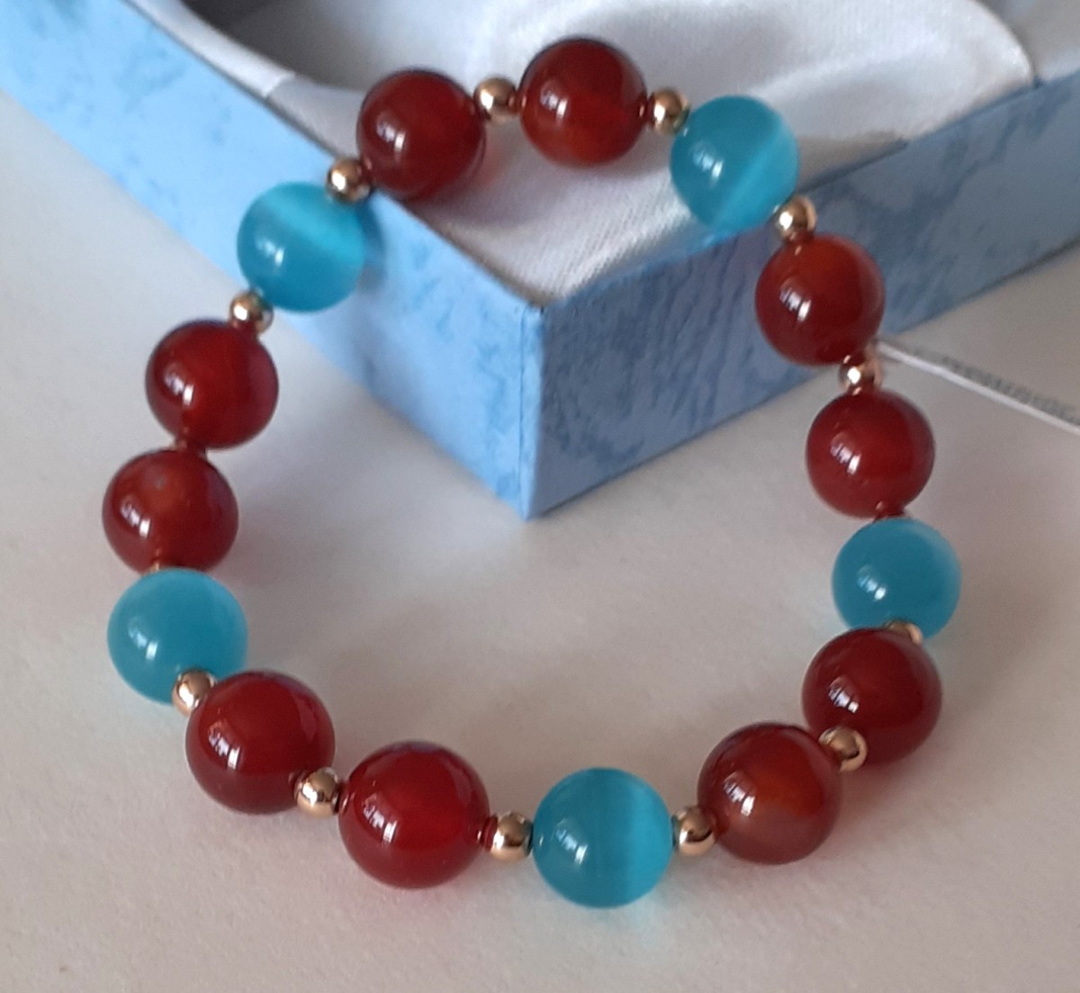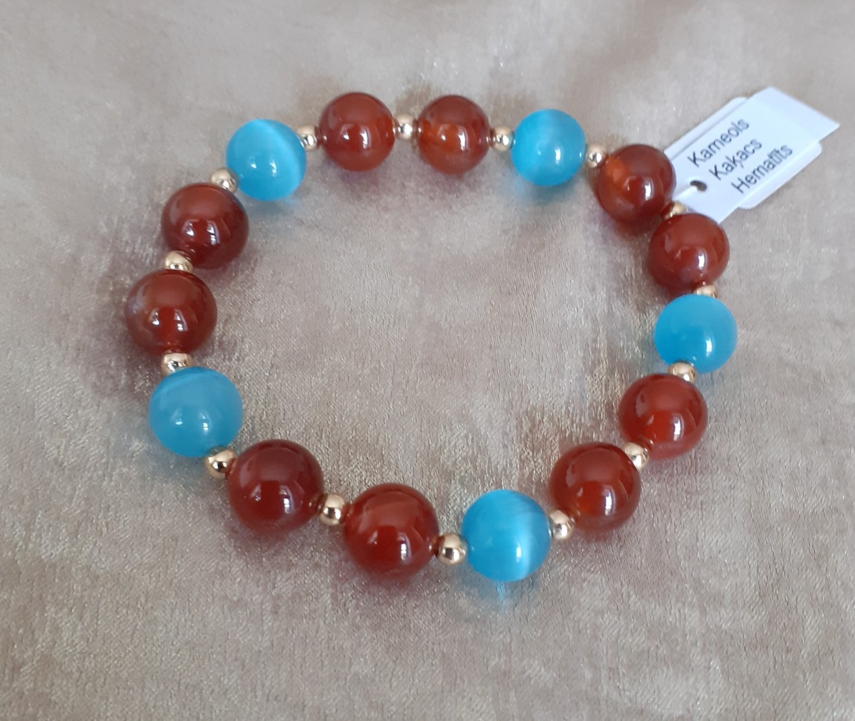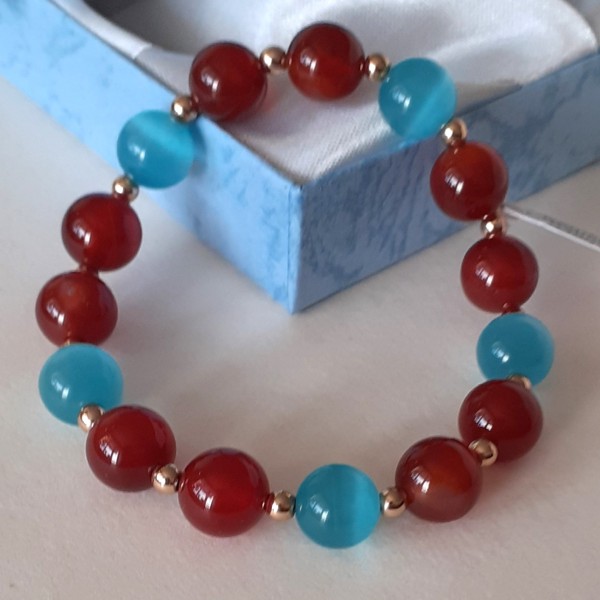 Aproce izgatavota no 10mm zilās kaķacs, karneola un 3mm zelta krāsas hematīta pērlītēm, kas vērtas uz elastīgas gumijas.