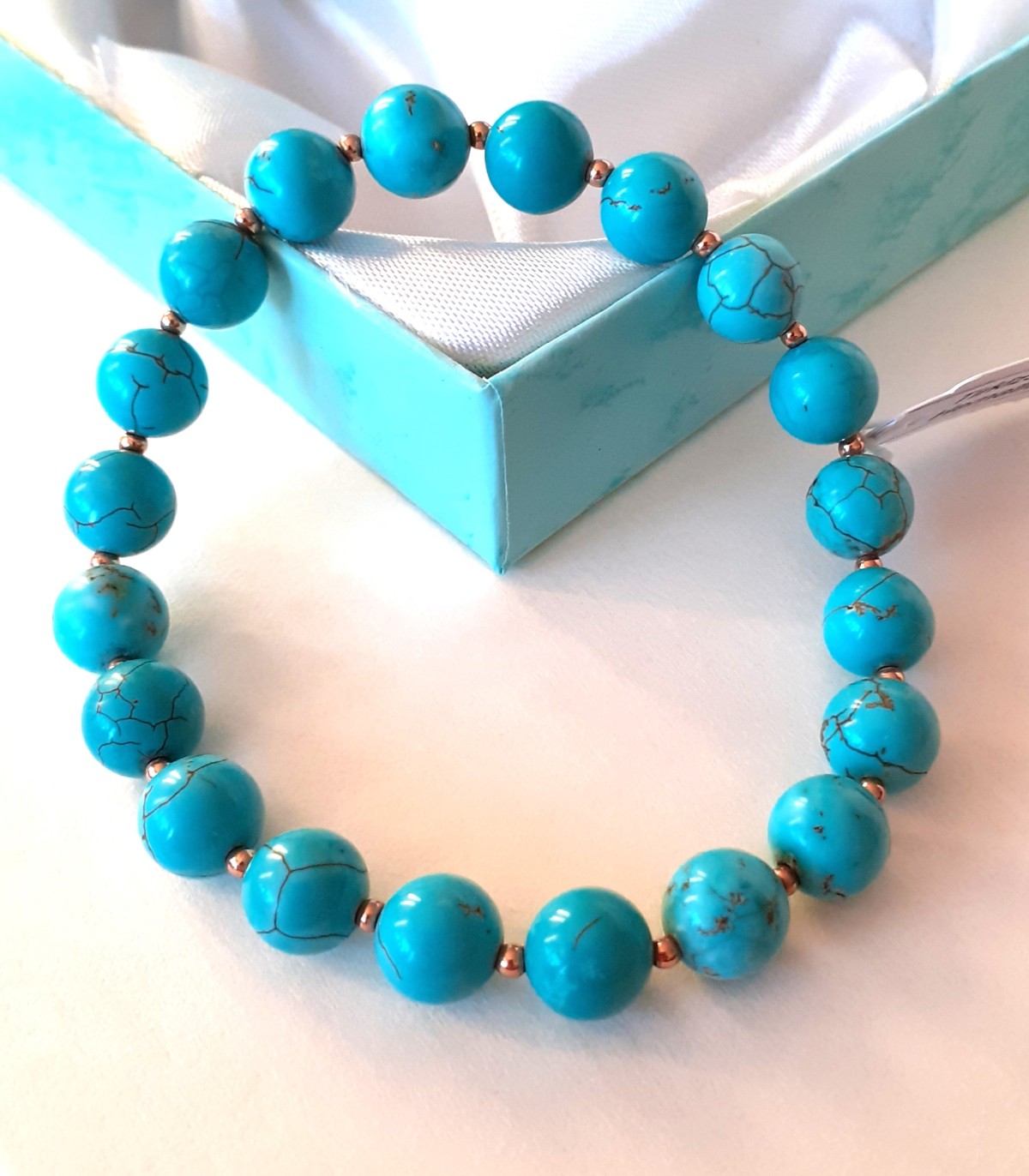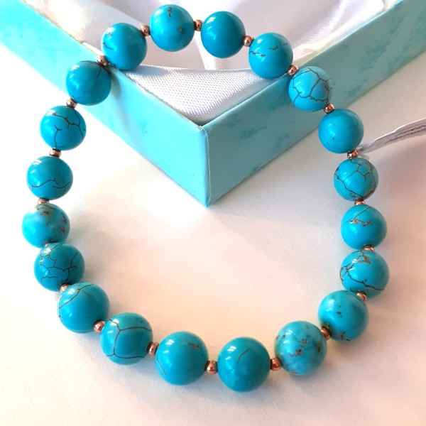 Aproce izgatavota no 8mm tirkīza un 2mm zelta krāsas hematīta pērlītēm, kas vērtas uz elastīgas gumijas.