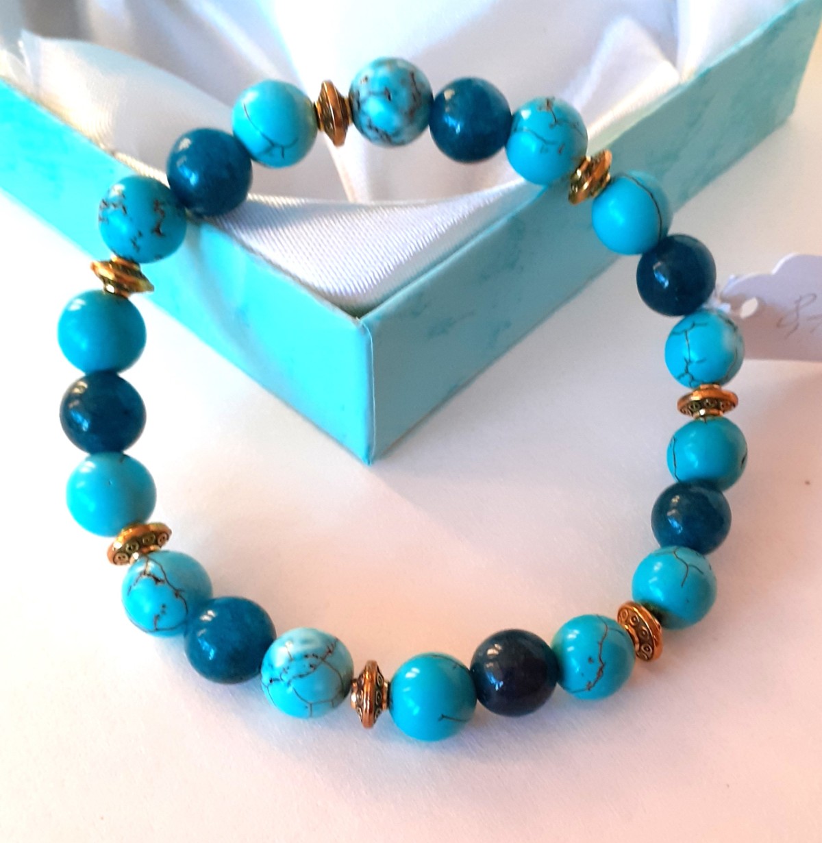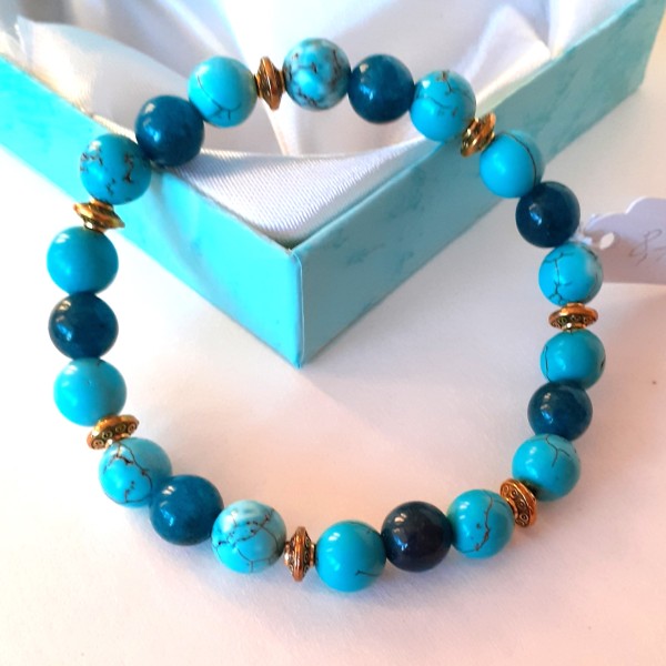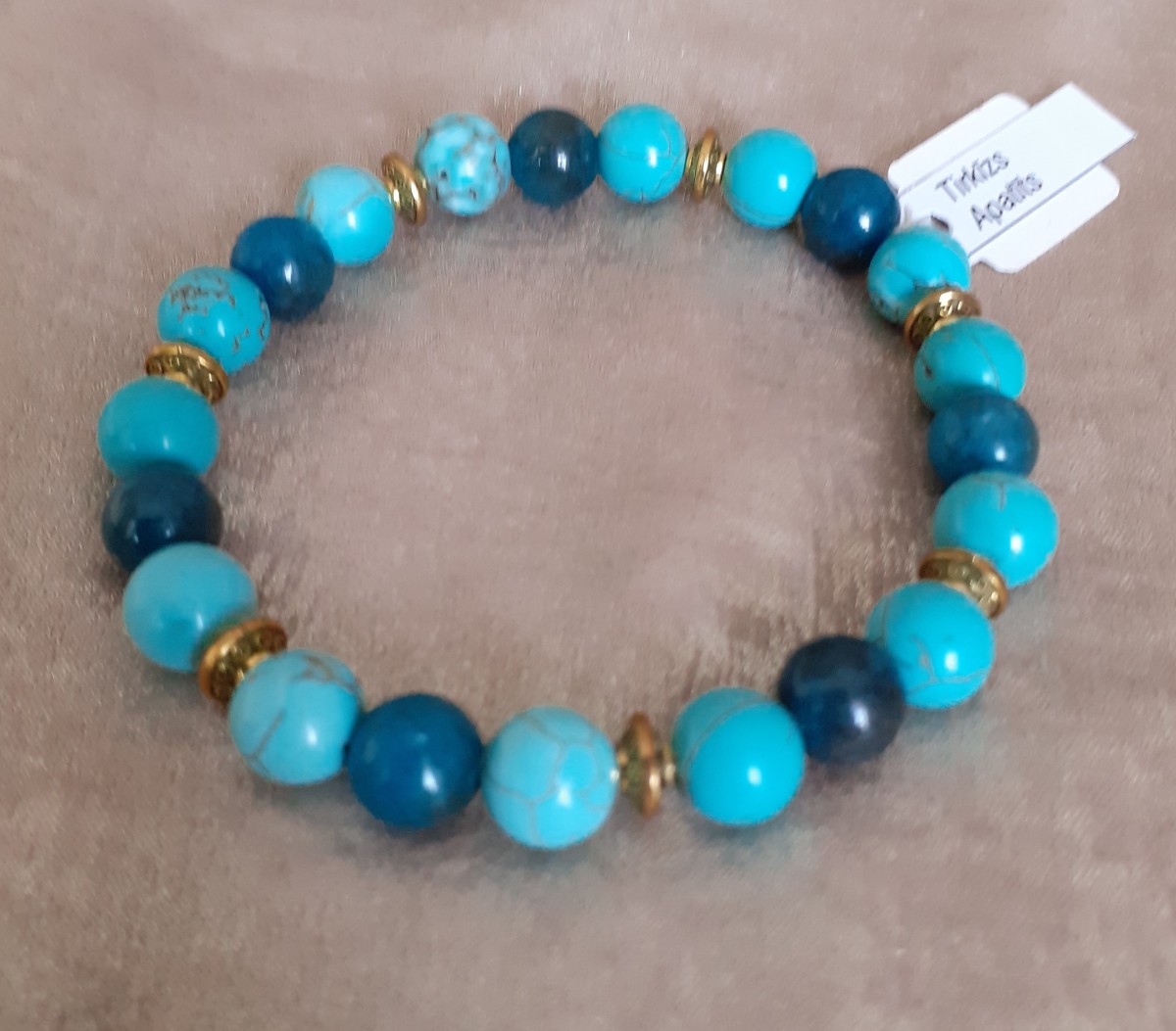 Aproce izgatavota no 8mm tirkīza, apatīta un nerūsējošām metāla detaļām, kas vērtas uz elastīgas gumijas.