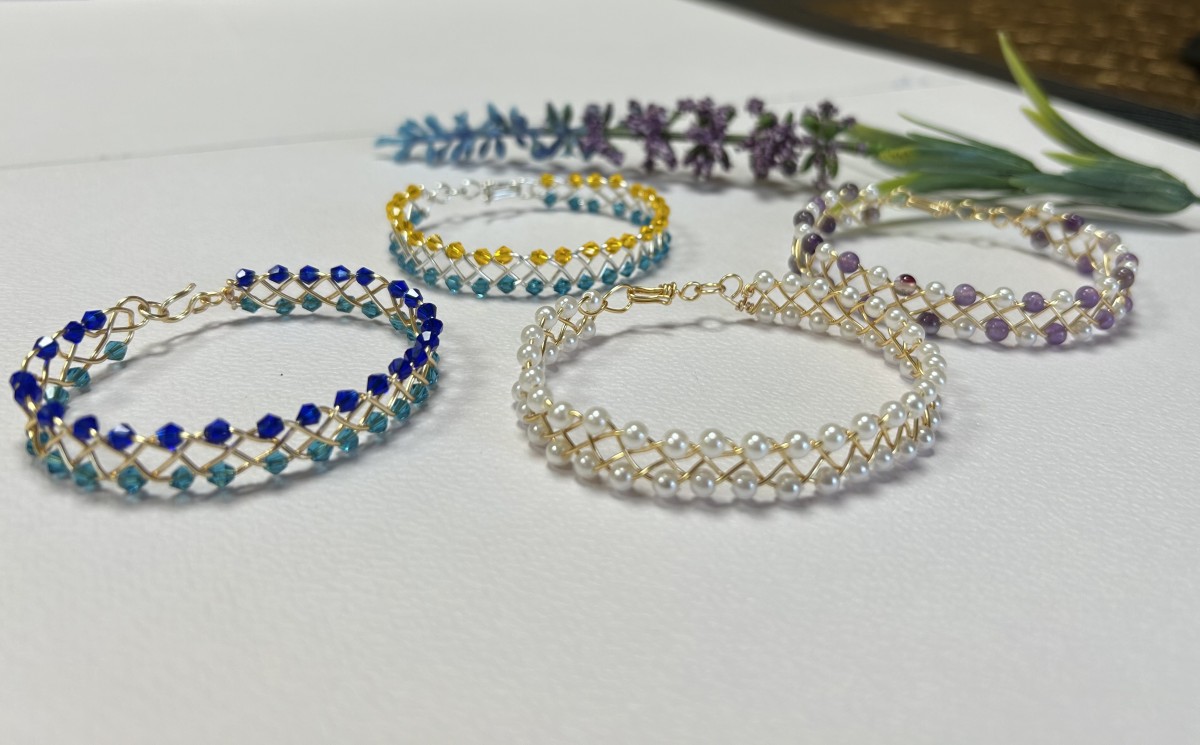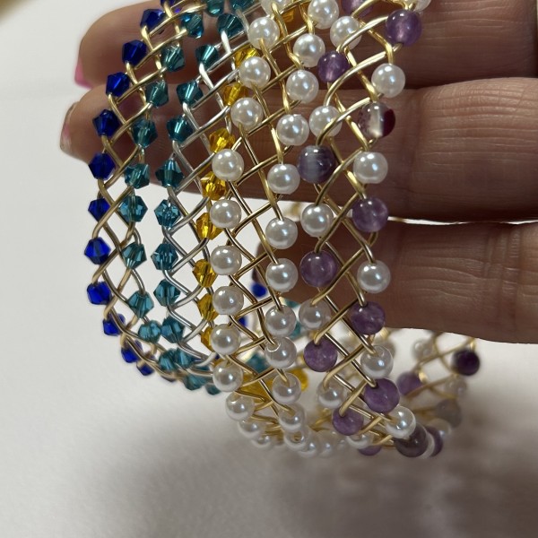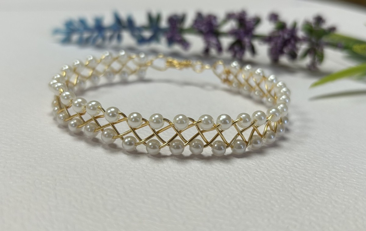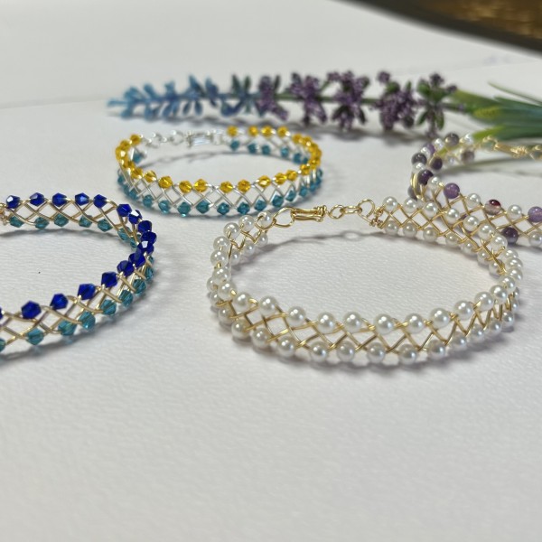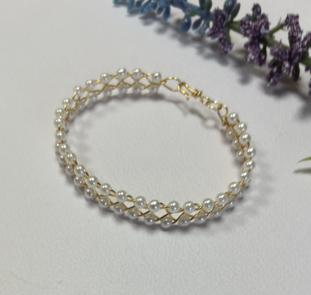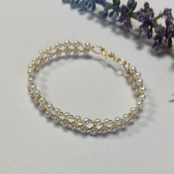 Tā tapa smalka rokassprādze – 0,8 mm zelta pārklājuma stieplē maigi iepītas 4 mm baltas Pearl pērlītes. Tās rindojas kā rasas pilieni uz zelta stieples vijuma, radot vieglu un gaisīgu rakstu. Rotu noslēdz rokām pīts āķītis, kas tur sprādzi kopā gluži kā mazs noslēpums, kas glabā šo vasaras rīta stāstu.