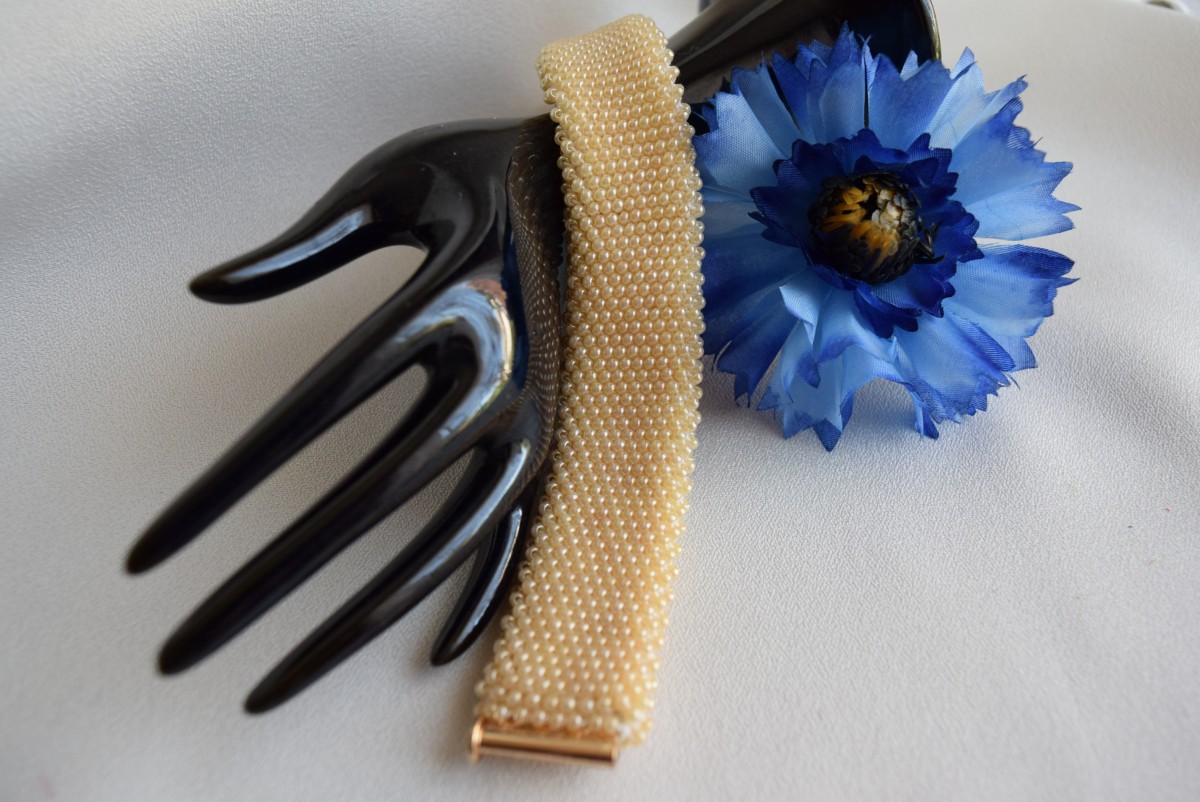 Smalka rokassprādze no zaigojošām japāņu pērlītēm zilā krāsā. Magnētiskā aizdare dzeltenā krāsā. Rokassprādzes garums ir 19 cm.