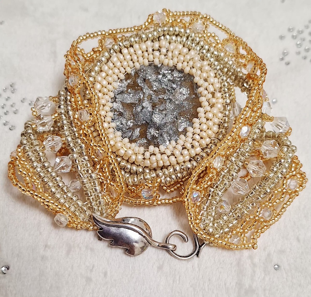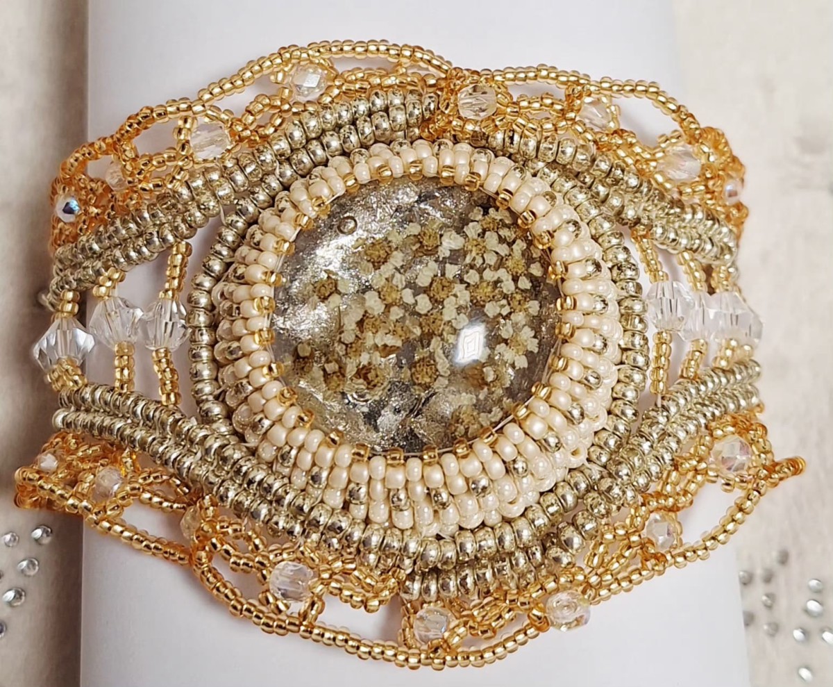 Rokassprādze izgatavota no Čehu stikla pērlītēm, metāla aizdare (Ķīna). Rokassprādzes centrā kabašons izgatavots no epoksīda svieķiem, ar kaltētiem ziediem (pelašķi) un sudraba foliju. Garums kopā ar aizdari 21 cm (garums nav regulējams).