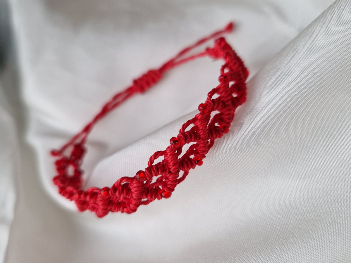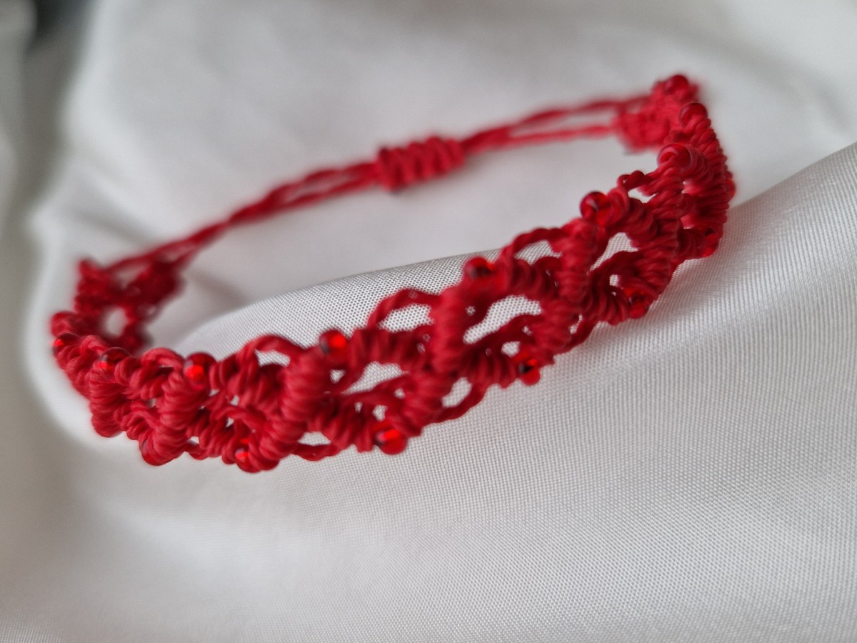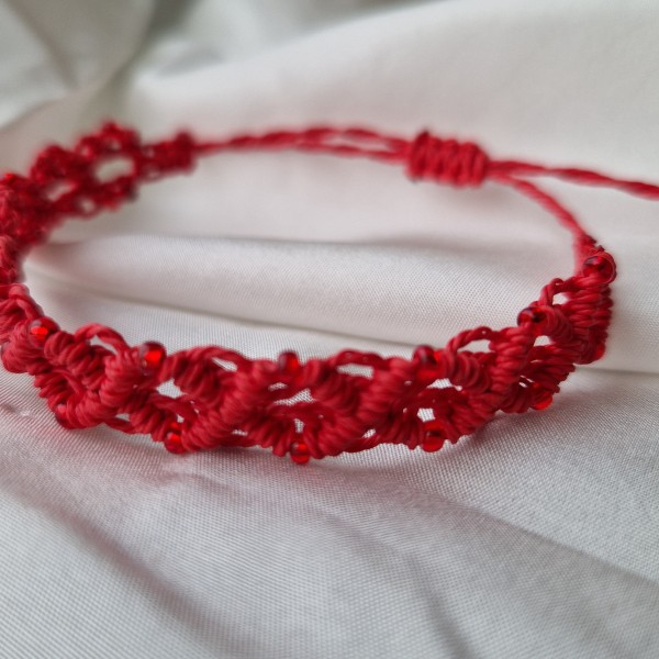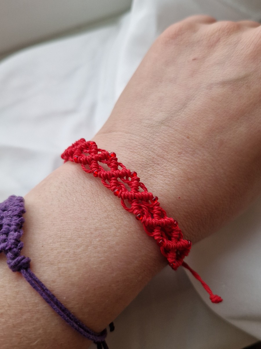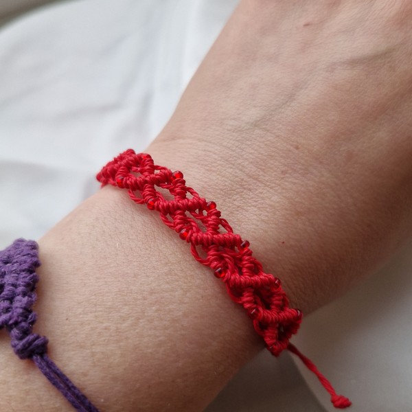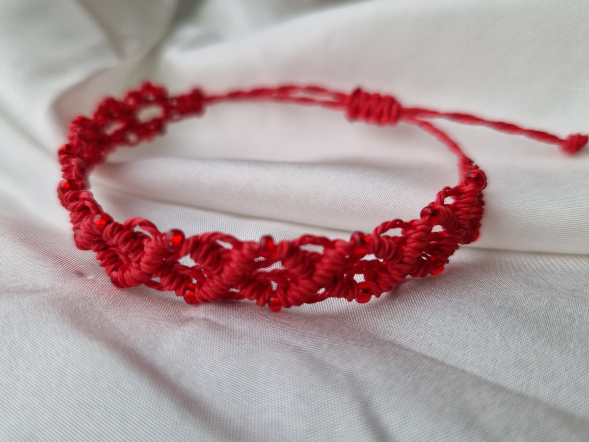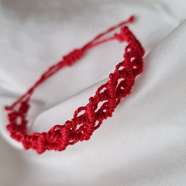 Draudzības rokassprādze. Burvīga, smalka un viegla , kura veidota makramē tehnikā. Akcentam sarkanas stiklā sēkliņpērlītes. Piestāvēs dabīgam un boho stila mīļiem. Rokassprādzes kopējais garums ap 25cm Dekoratīvā josla 12x1cm. Aizdarei slīdošais mezgls, kurš ļauj mainīt rokassprādzes lielumu.