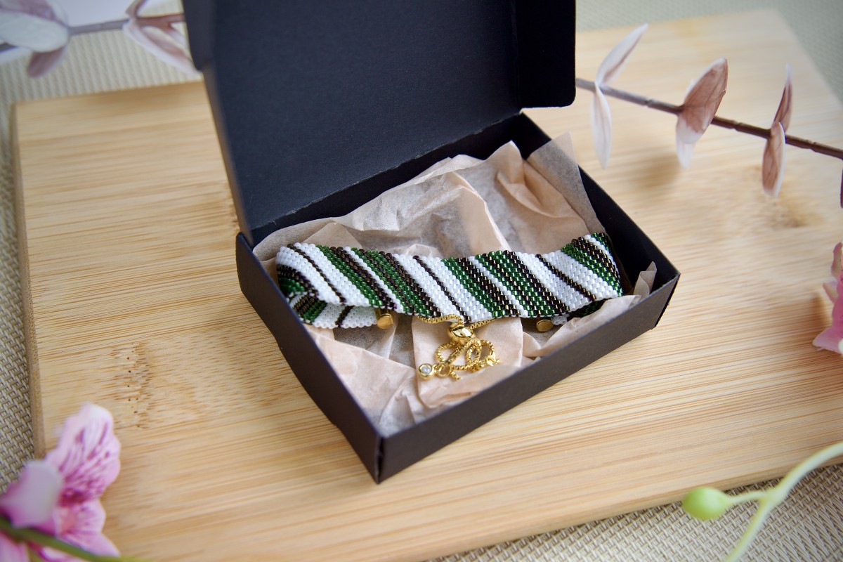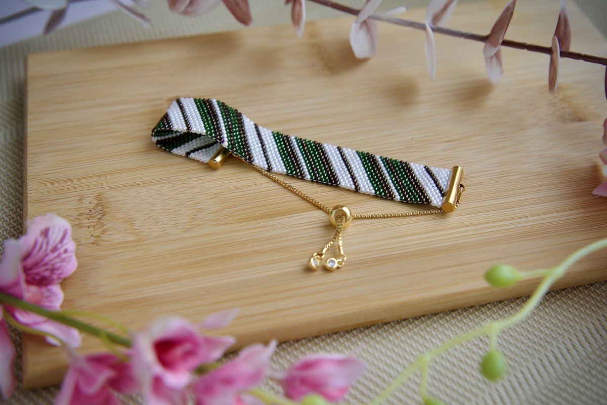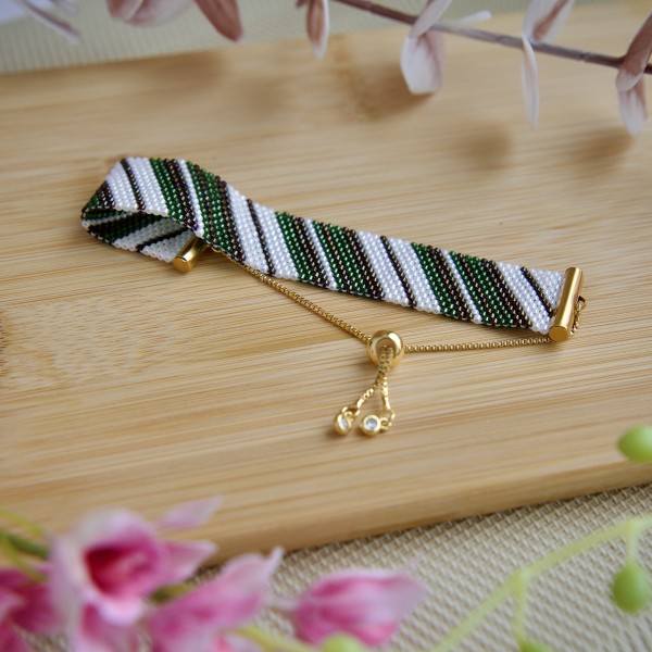 Sīkpērlīšu rokassprādze ar skaistu dizainu. Izmērs regulējams no 16cm līdz 20+cm rokas apkārtmēram. Iepakota kastītē, gatava dāvana