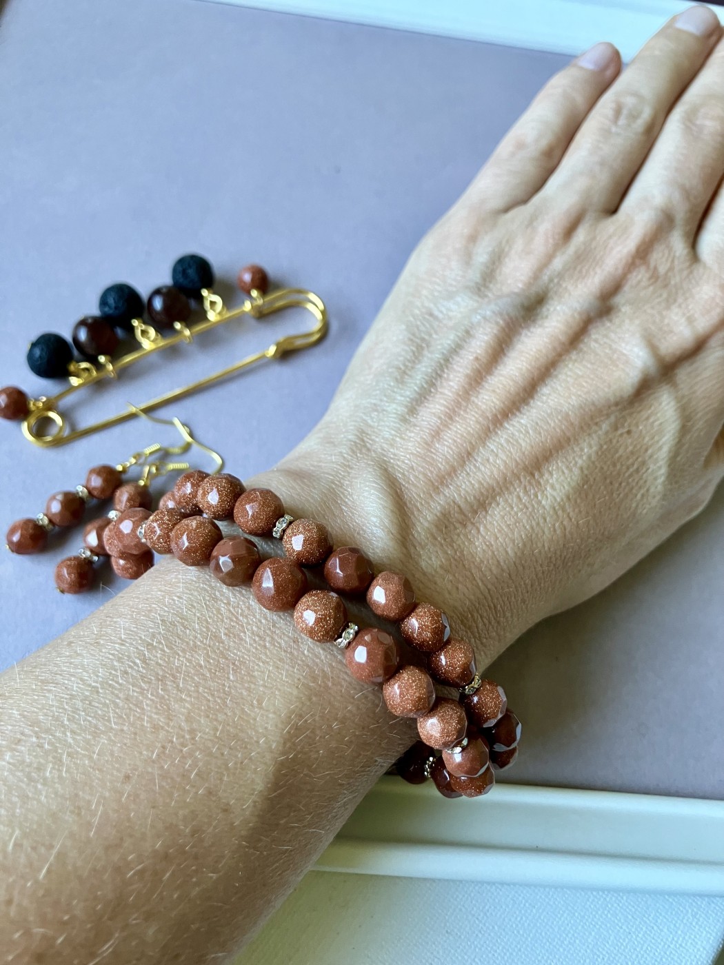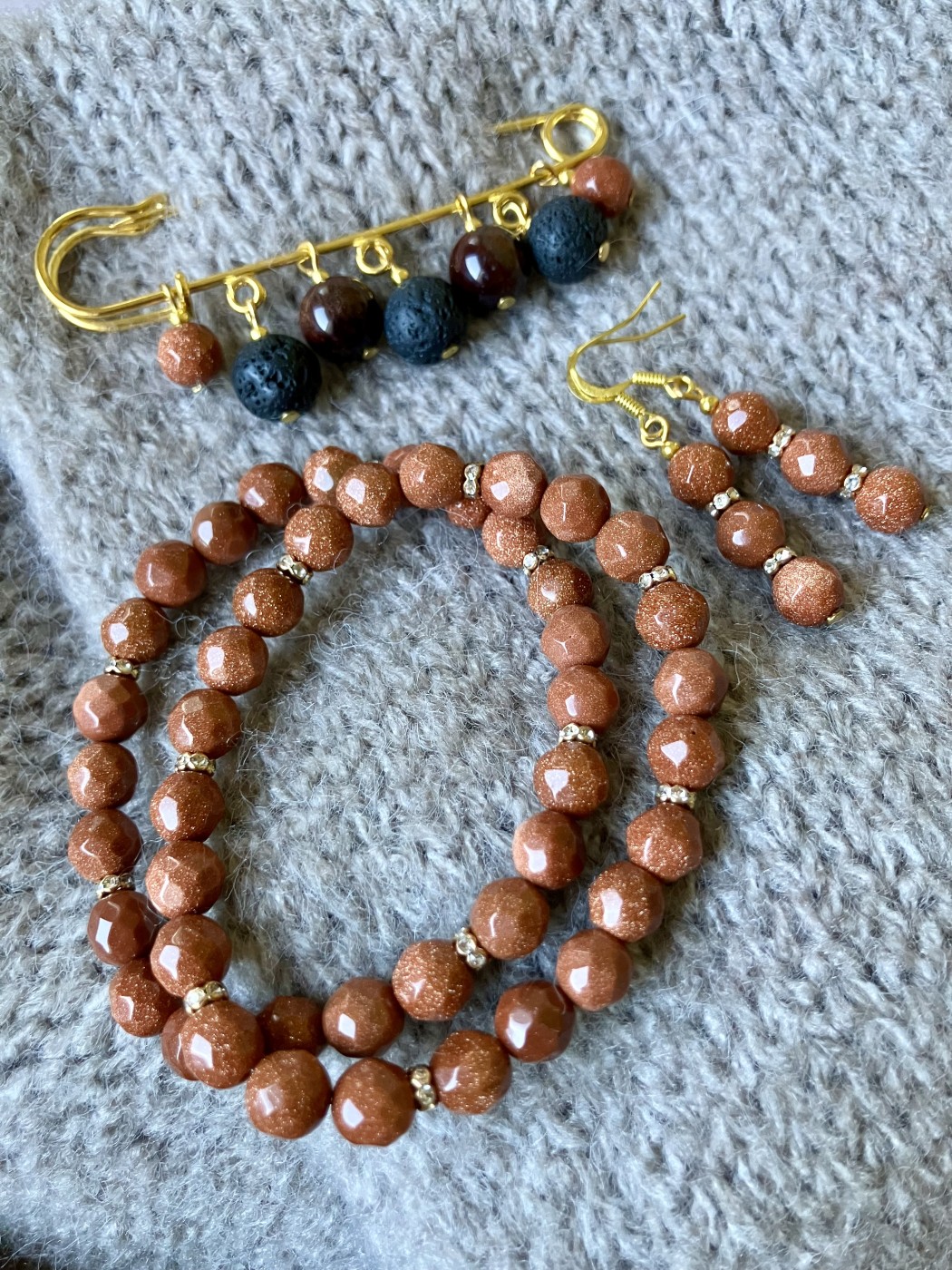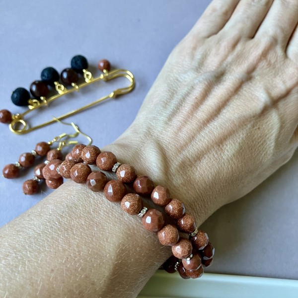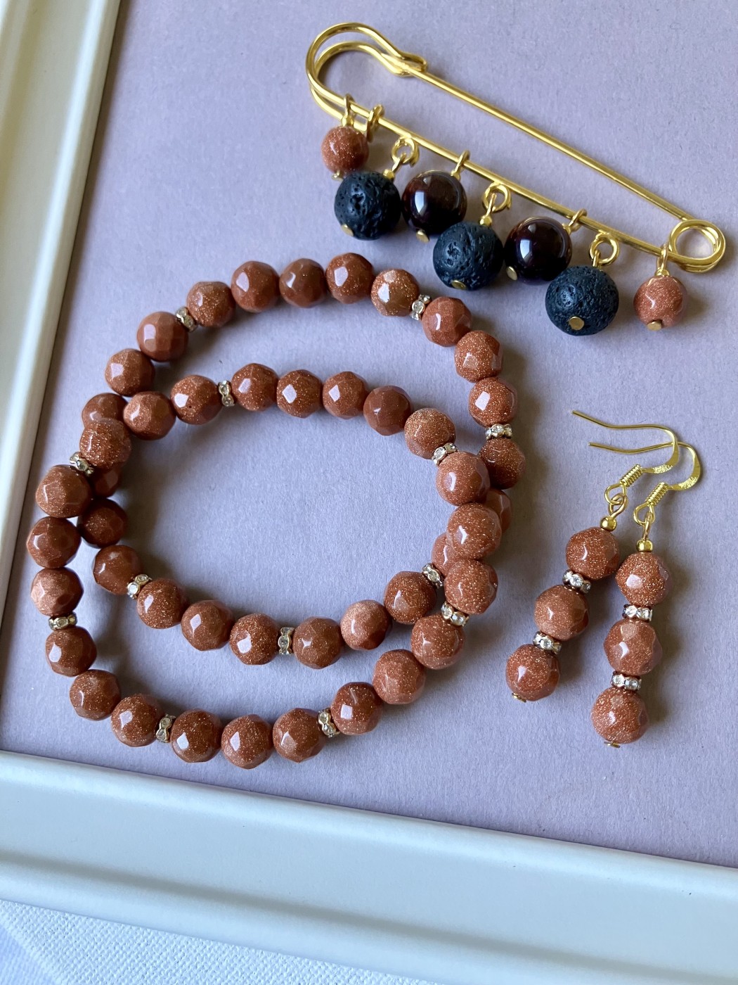 Rotu komplekts rudenīgos toņos - rokassprādzes, piespraude un auskari, lieliska ideja dāvanai.