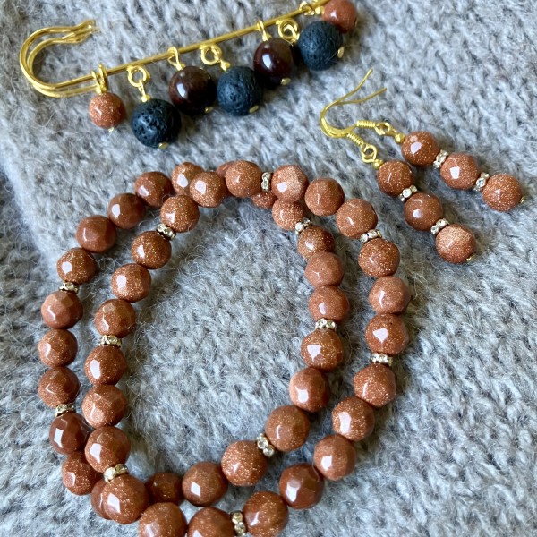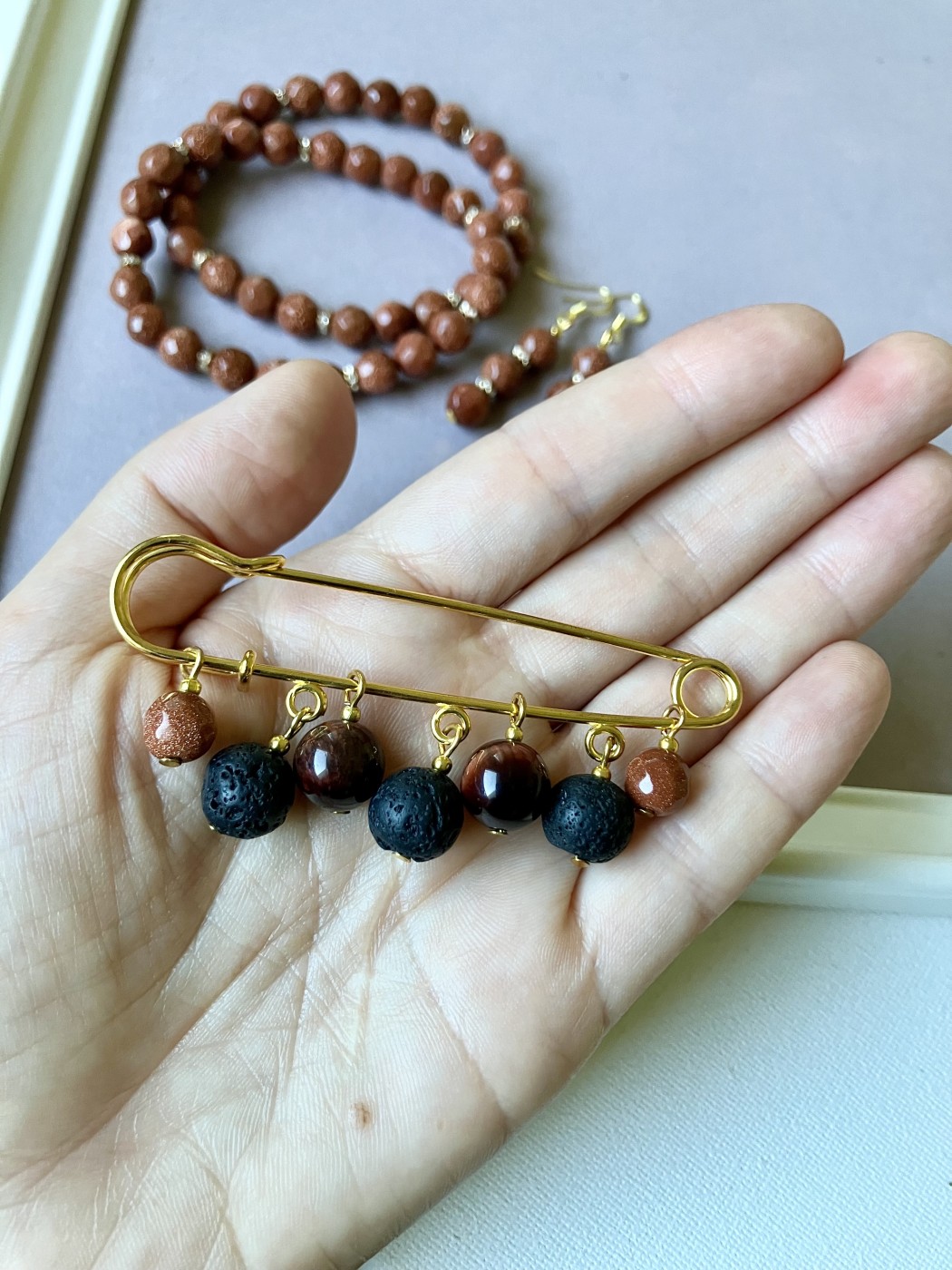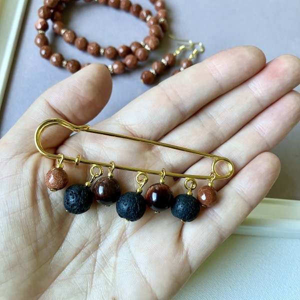Materiāli: zeltakmens, tīģeracs, lavas pērles, zelta krāsas furnitūra.