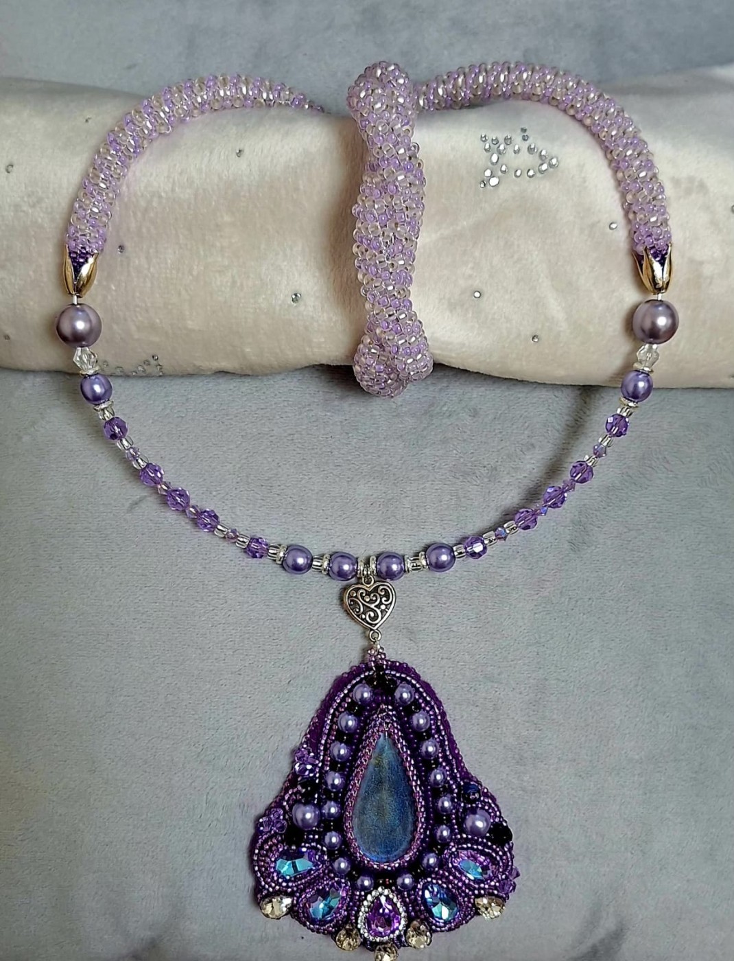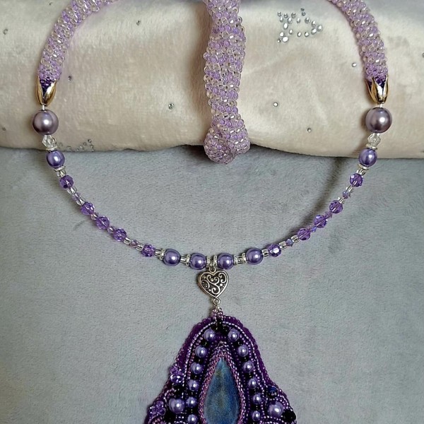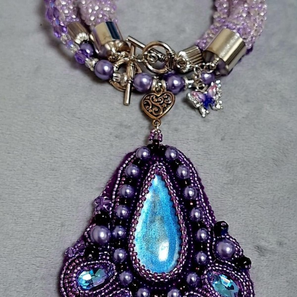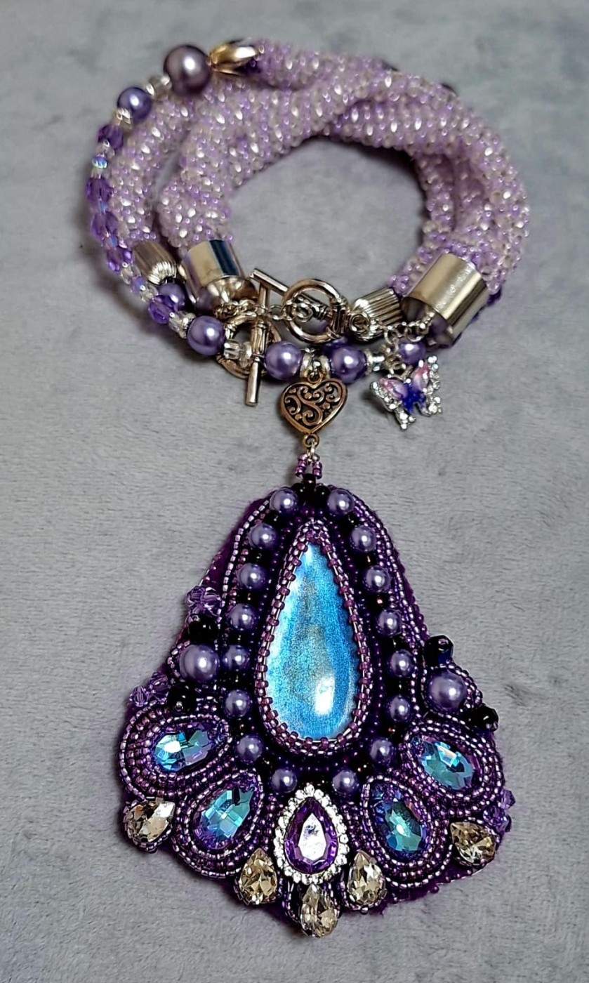Komplekts no kaklarotas ar kulonu un rokas sprādzi. Izmantotie matieriāli: stikla pērlītes (Čehija, Japāna, Ķīna), atmiņas stieple, metāla aizdares un piekariņi. Kulona kabašons izgatavots no epoksīda sveķiem, maina krāsu atkarībā no apgaismojuma (no viegli brūnas līdz zilgani violetai, jo spilgtāka gaisma, jo izteiktāts tonis). Kaklarotas garums aptuveni 50 cm (bez aizdares), kulona garums 9 cm, platums 2-7 cm. Rokasprādzes garums bez aizdares 19cm (ar aizdari 23 cm).